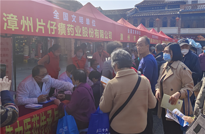 活动现场,漳州片仔癀药业股份有限公司联合片仔癀国药堂,为市民“零距离”提供中医义诊及健康保健咨询志愿服务。在义诊过程中,片仔癀名医馆陈羿澍医生和张震焱医生认真聆听市民们提出的问题和症状,耐心细致地为市民朋友把脉开方,做专业的解答和健康指导。片仔癀第一党支部及片仔癀国药堂党支部的党员志愿者们为前来问诊咨询的群众积极宣传我国中医药发展新政策,积极传递中医养生理念,提高群众健康意识、健康水平,同时,免费为群众发放医馆精心制作的香囊以及片仔癀护手霜等物品,受到广大群众的广泛好评。