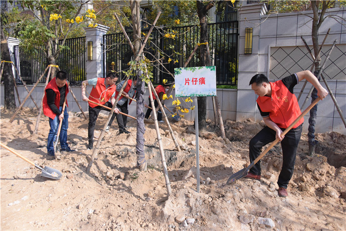 上午,在药业公司党委的带领下,片仔癀保健食品党支部志愿者们,来到漳州市实验小学龙文校区旁的沿街绿化带上开始了植树活动。大家分工协作,有的护苗,有的浇水,有的培土,各个环节都衔接有序、配合默契。经过挥汗奋战,一株株茁壮的树苗稳稳地扎根土壤中,将来为祖国的花朵们遮风挡雨。