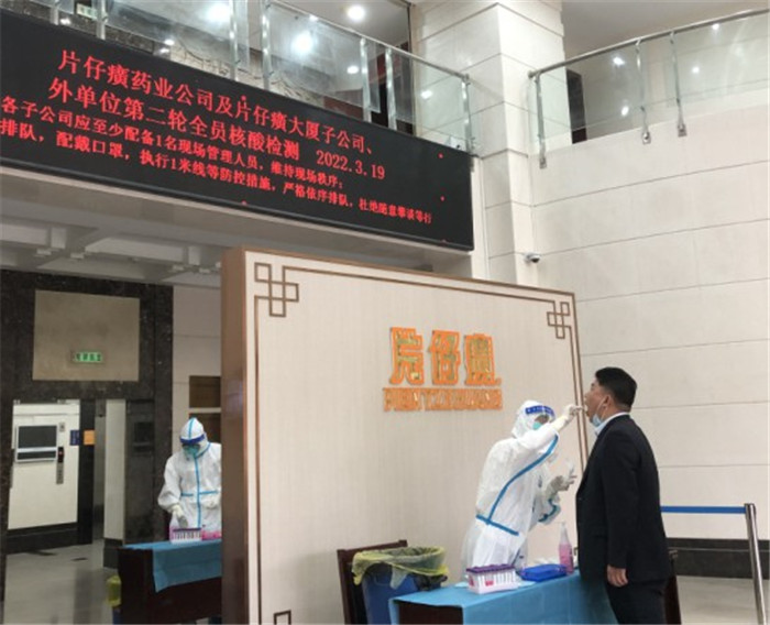近日,片仔癀药业公司召开疫情防控工作部署会,加强组织领导;及时出台相关文件,严格落实值班值守制度;开展每日健康监测,排查风险人群;强化门岗管控,严控外来人员进出公司;调整食堂疫情用餐方式,取消堂食,实行订餐、分餐、错峰取餐;提高厂区、办公场所等区域的消杀力度,阻断传播条件;主动开展多轮全员核酸检测工作,排查潜在风险。