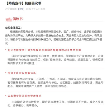 为加强疫情防控知识的宣传和普及,提高职员疫情防范意识,片仔癀药业公司充分利用泛微工作群、公告栏、LED屏等媒介进一步宣传疫情防控知识,并发放疫情防控电子倡议书,要求全体员工提高警惕,减少不必要的出行和聚集,加强个人防护。通过“线上+线下”双线并进的方式进行抗疫宣传,做到疫情防控形势人人知晓,防控行动全民参与,防控知识入脑入心。
