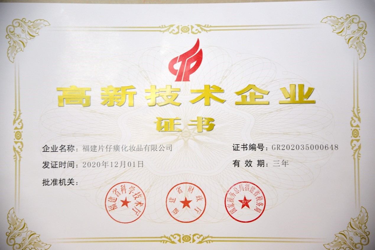 福建片仔癀化妆品有限公司入选高新技术企业,同年公司皇后牌美白祛斑膏、片仔癀牌御润鲜妍保湿系列等新品上市。