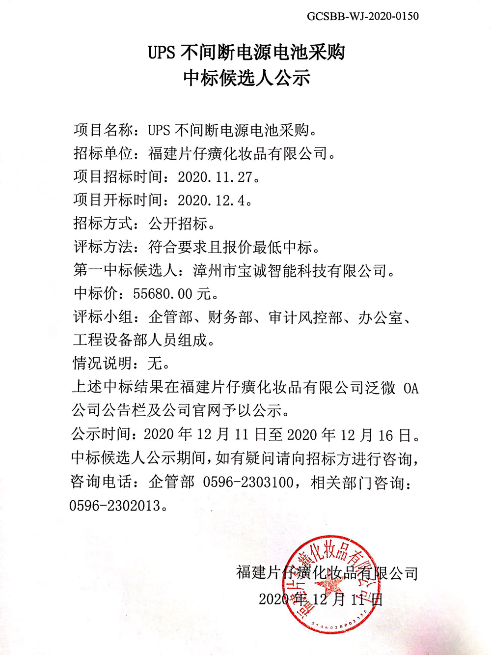 福建片仔癀化妆品有限公司UPS不间断电源电池采购中标候选人公示