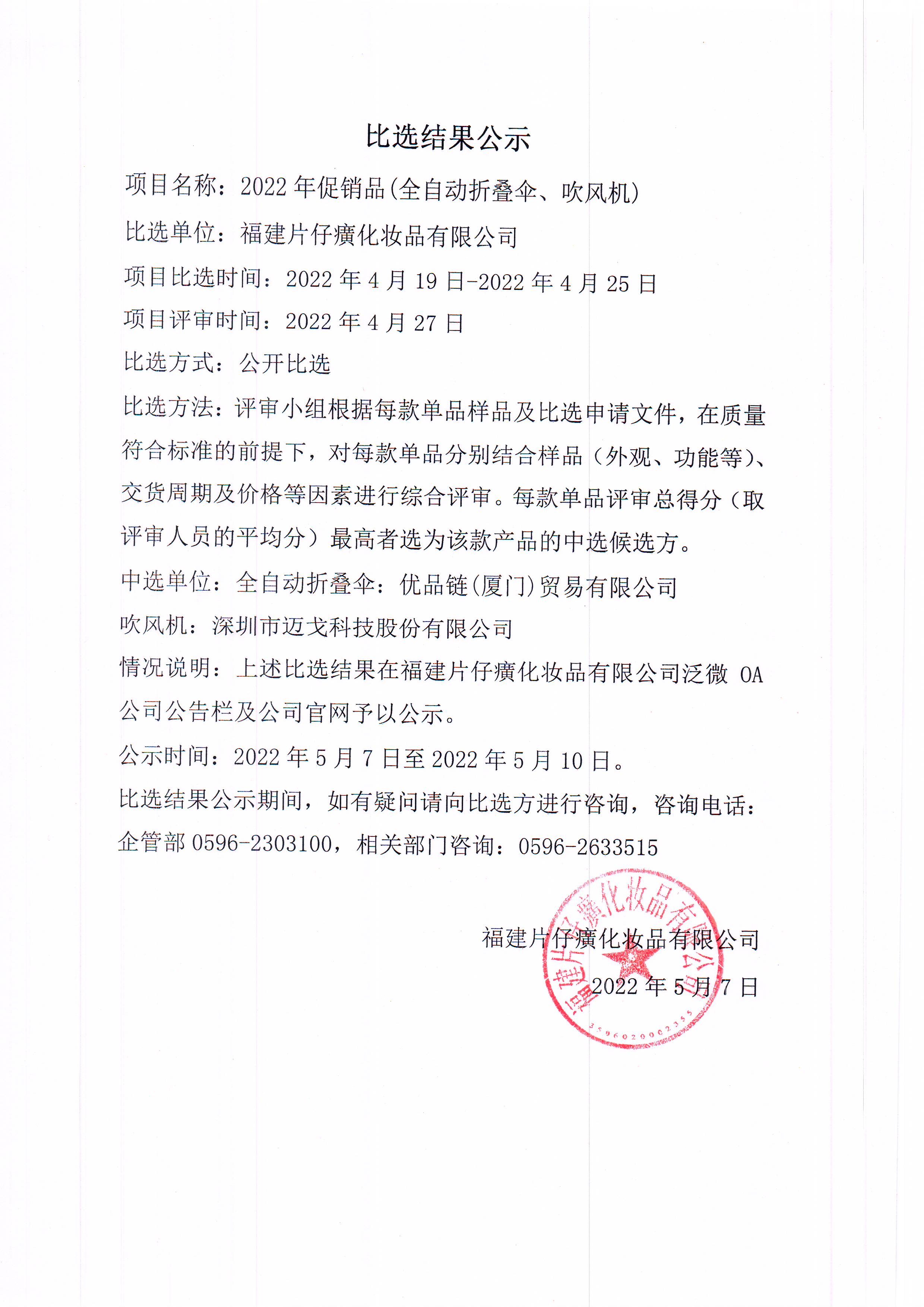 福建片仔癀化妆品有限公司2022年促销品(全自动折叠伞、吹风机)比选结果公示