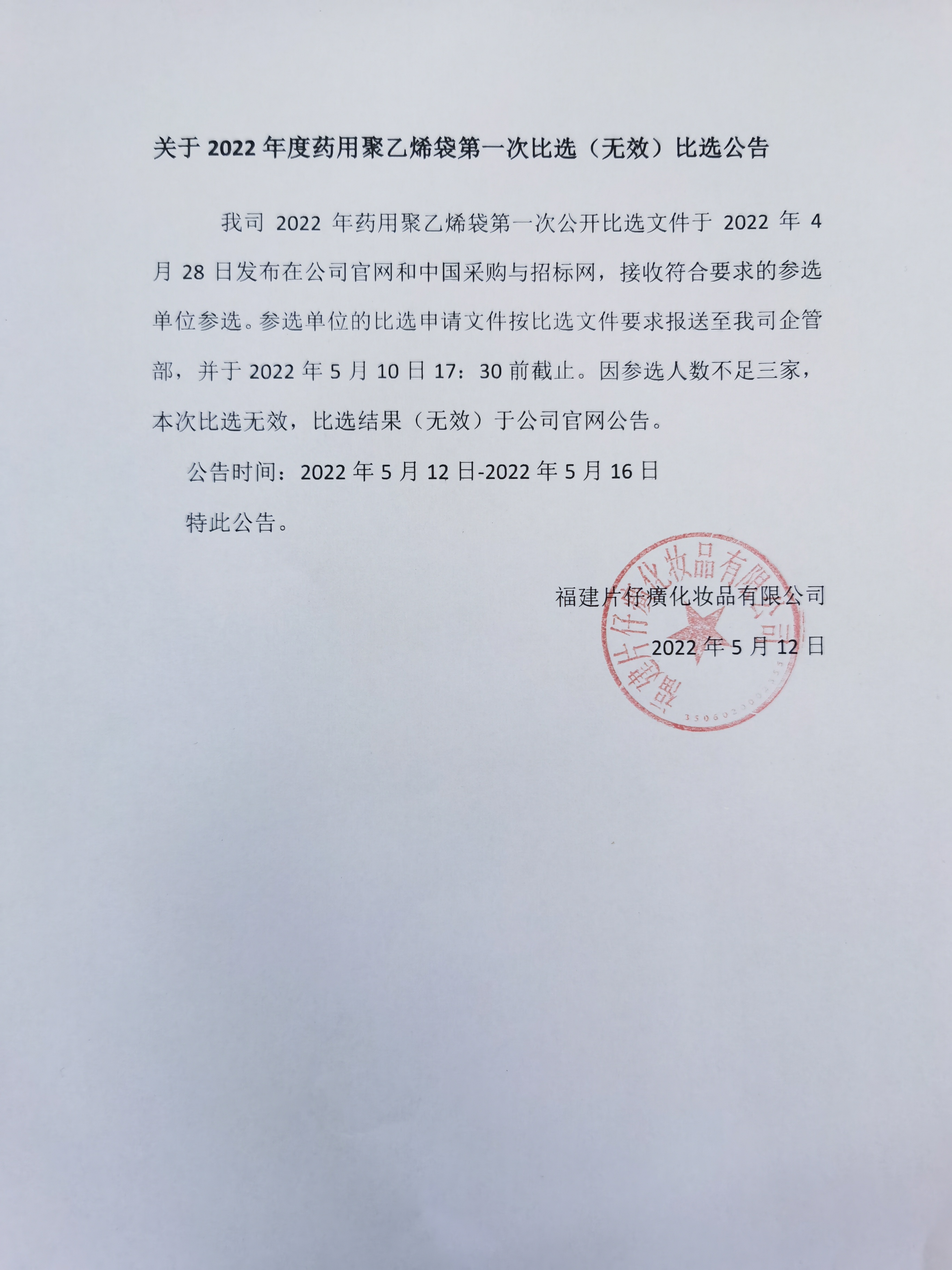 福建片仔癀化妆品有限公司关于2022年度药用聚乙烯袋第一次比选(无效)比选公告