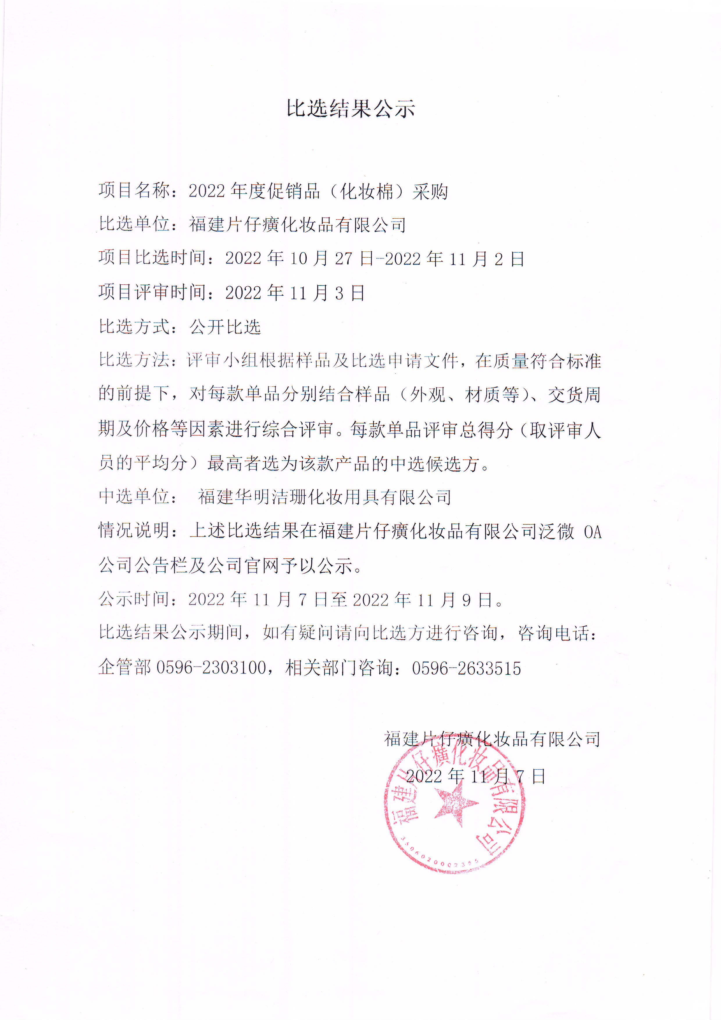 2022年度促销品(化妆棉)采购比选结果公示