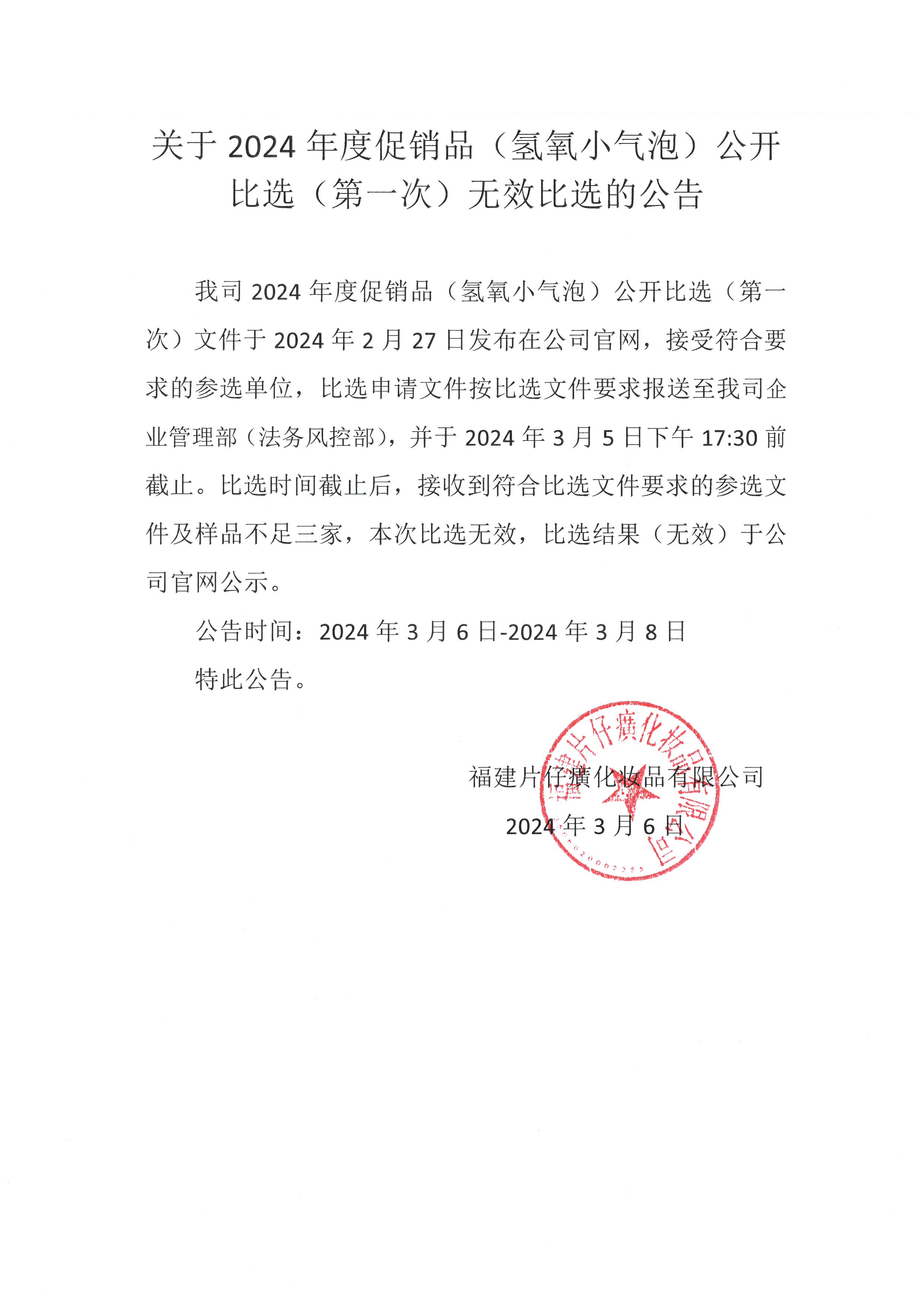 关于2024年度促销品(氢氧小气泡)公开比选(第一次)无效比选的公告