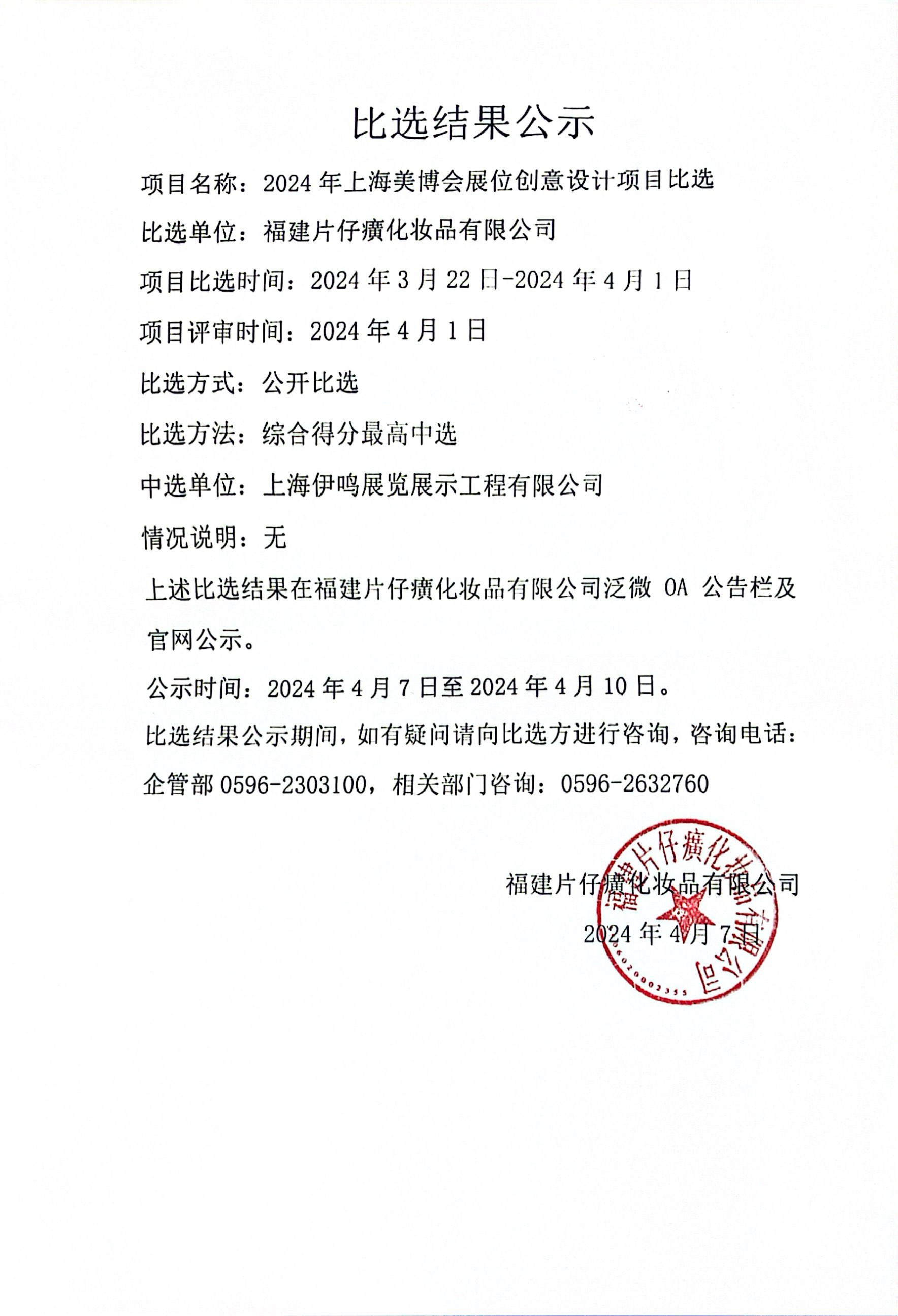 福建片仔癀化妆品有限公司2024年上海美博会展位创意设计项目比选结果公示