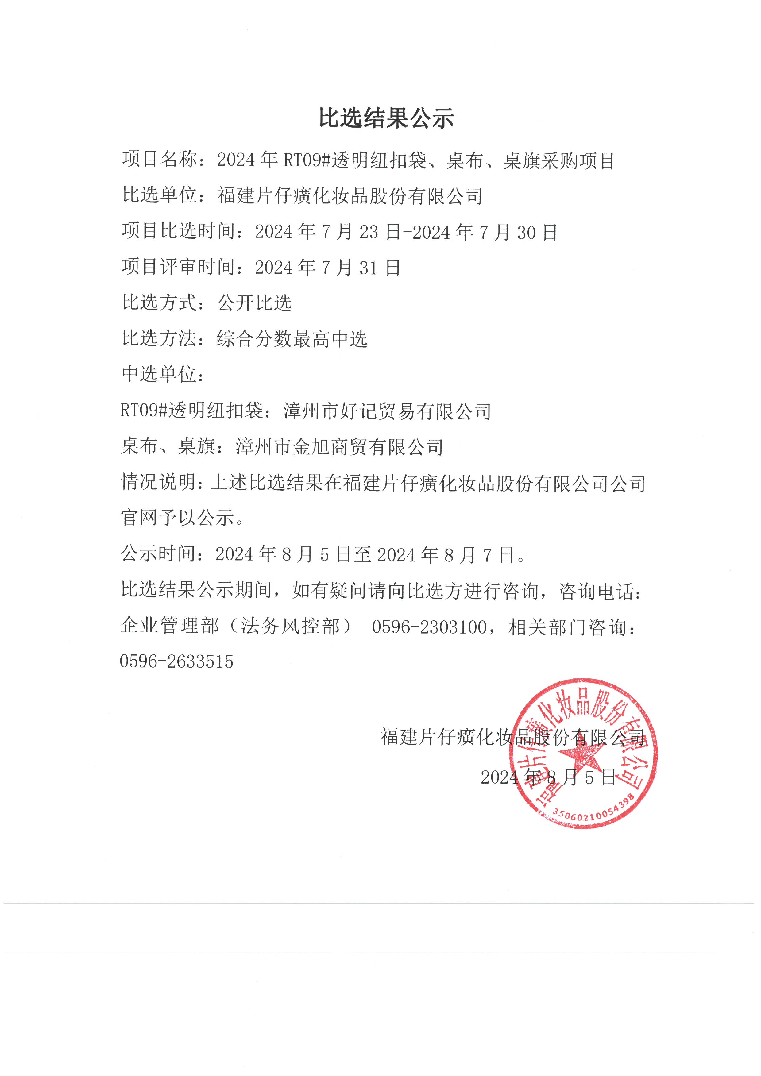 福建片仔癀化妆品股份有限公司2024年RT09#透明纽扣袋、桌布、桌旗比选结果公示