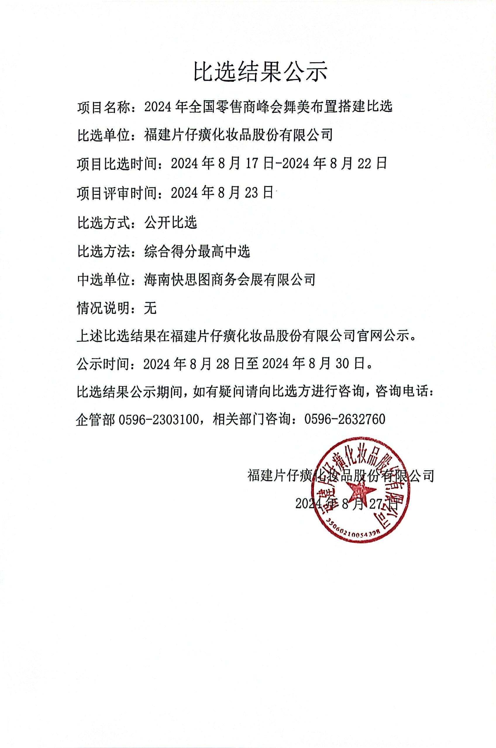 福建片仔癀化妆品股份有限公司2024年全国零售商峰会搭建比选结果公示