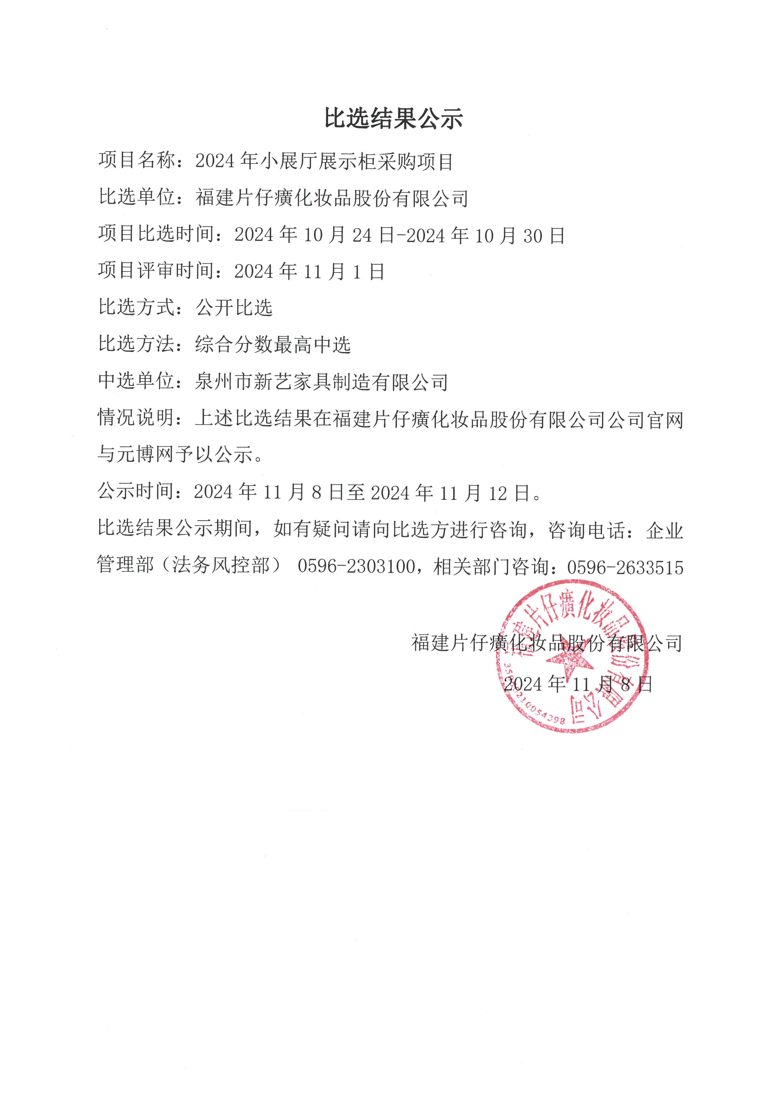 福建片仔癀化妆品股份有限公司2024 年小展厅展示柜采购项目比选结果公示