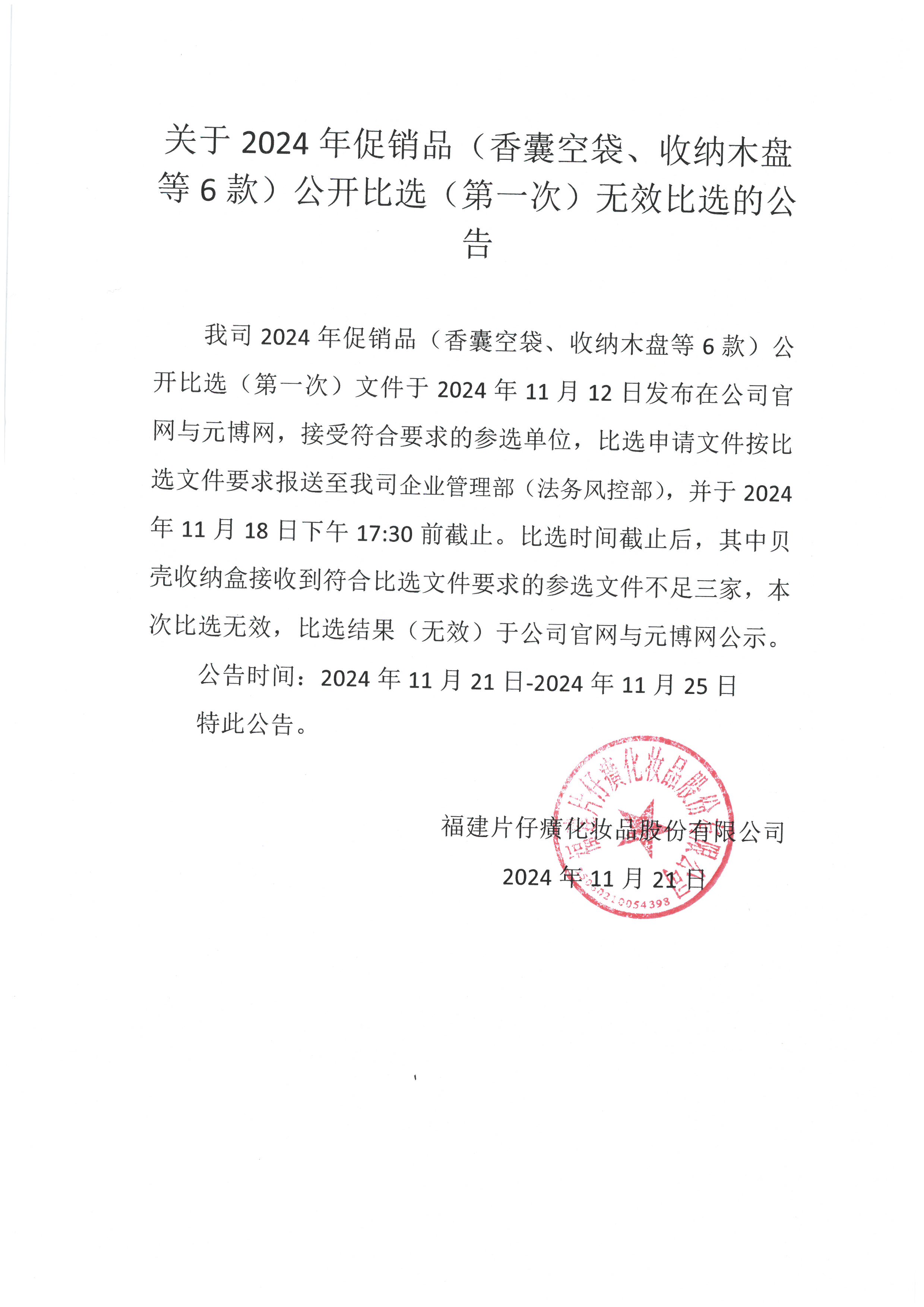 福建片仔癀化妆品股份有限公司2024年促销品(香囊空袋、收纳木盘等6款)采购无效比选公告
