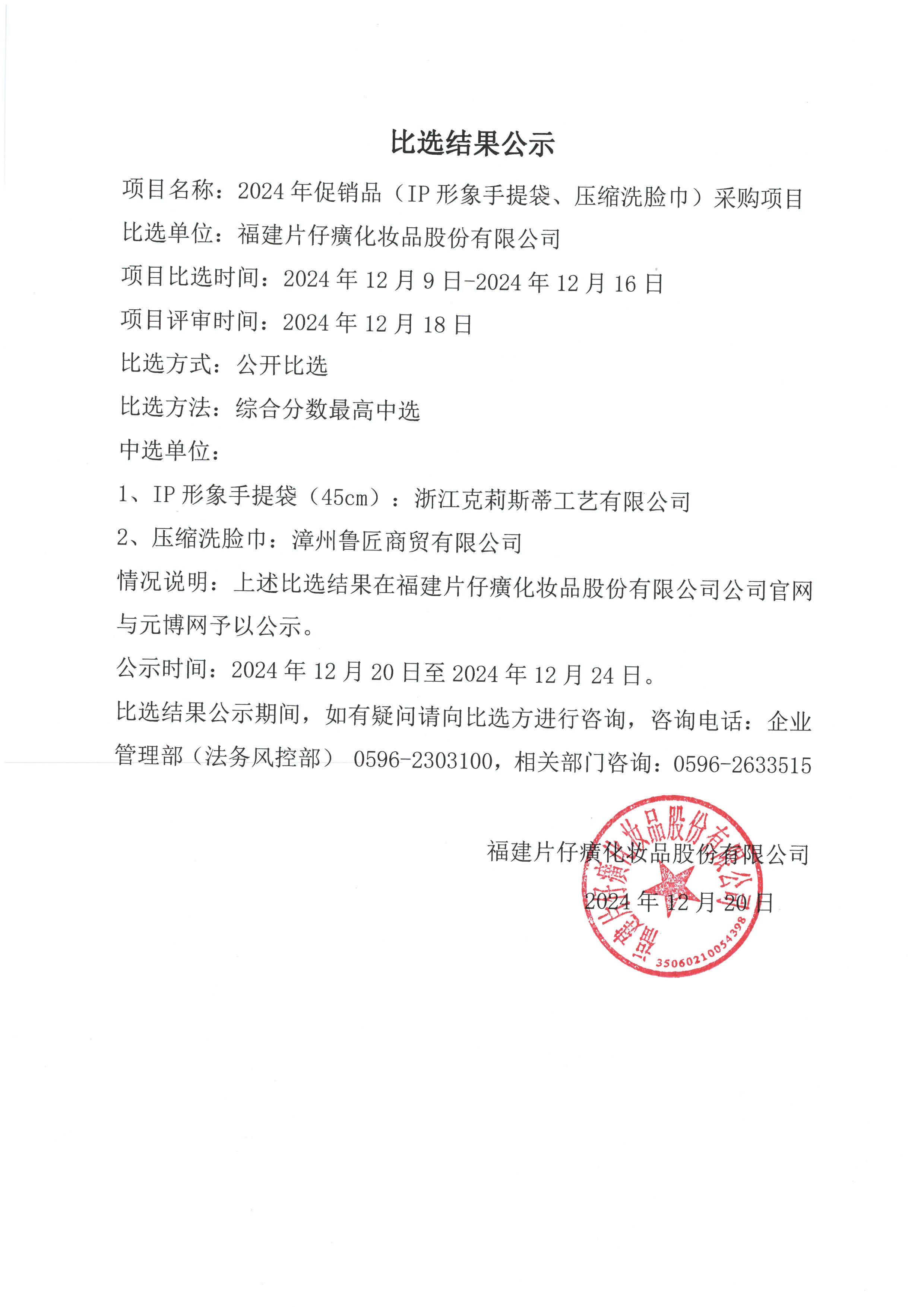福建片仔癀化妆品股份有限公司2024年促销品(IP形象手提袋、压缩洗脸巾)采购项目比选结果公示