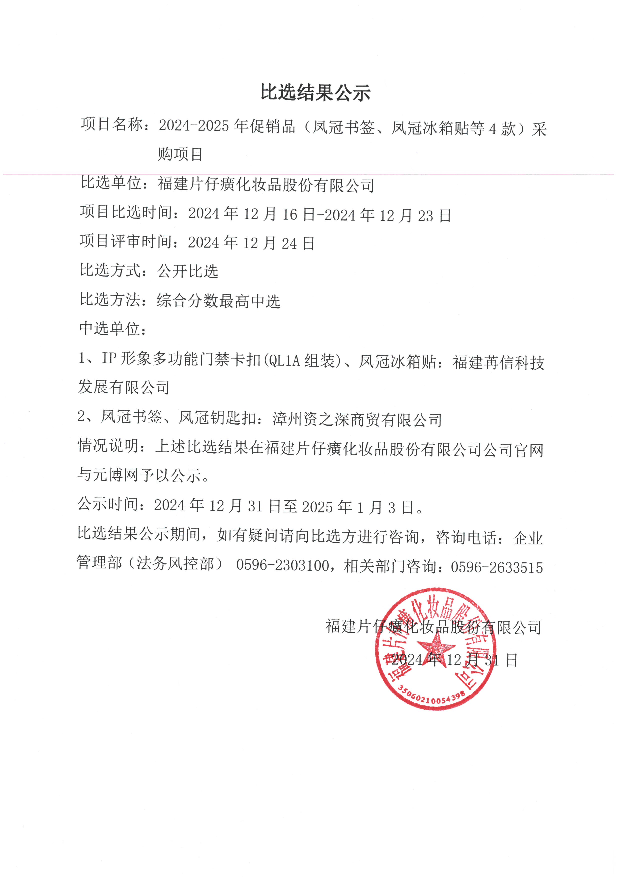 福建片仔癀化妆品股份有限公司2024-2025年促销品(凤冠书签、凤冠冰箱贴等4款)采购项目比选结果公示