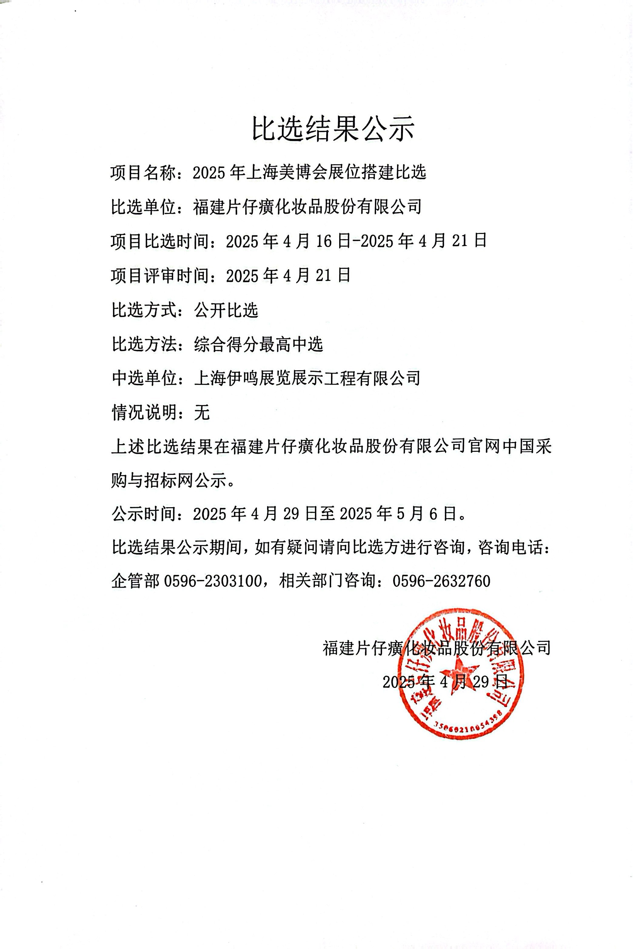 福建片仔癀化妆品股份有限公司2025年上海美博会展位搭建项目比选结果公示