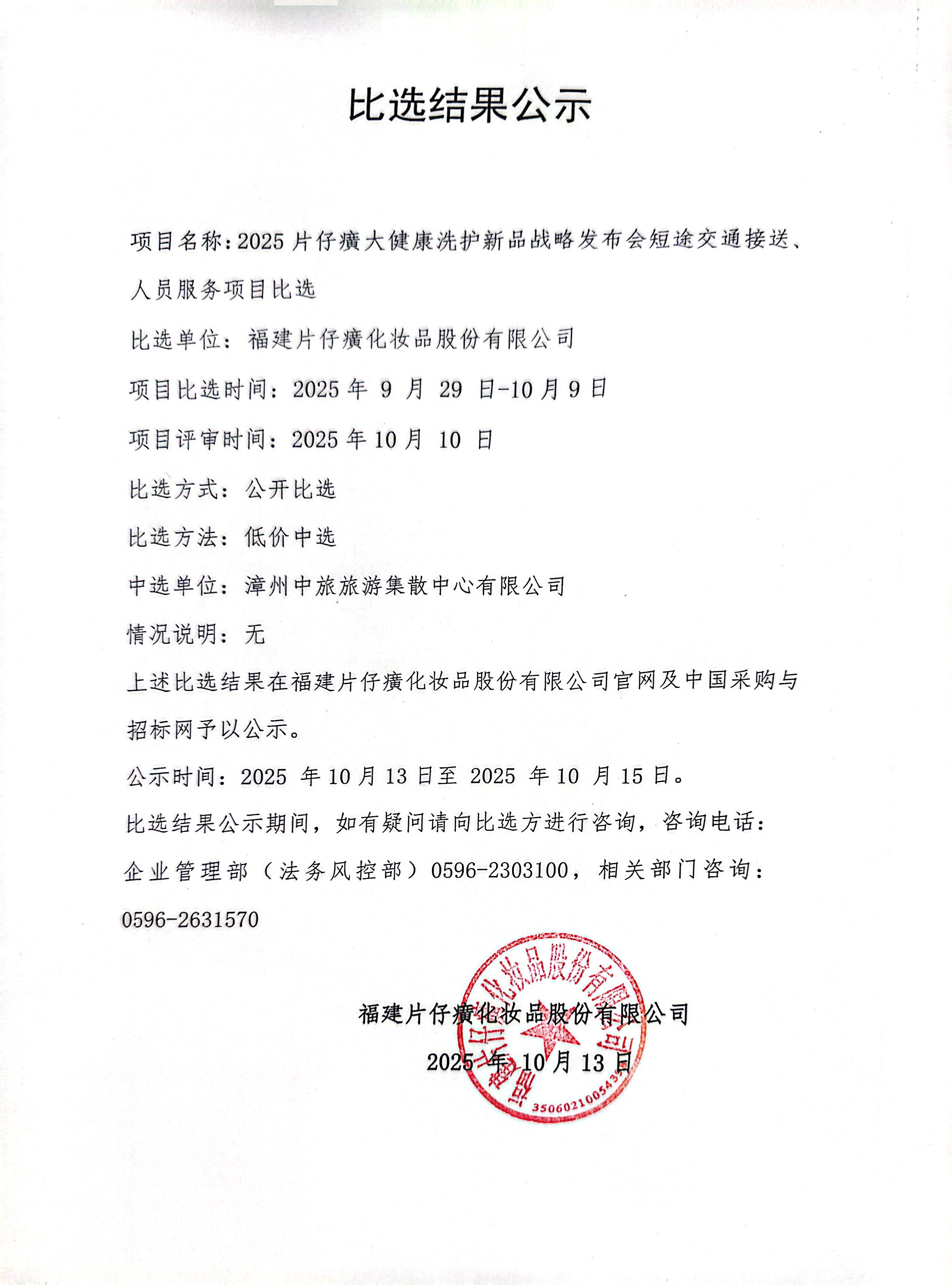 福建片仔癀化妆品股份有限公司2025片仔癀大健康洗护新品战略发布会短途交通接送、人员服务项目比选结果公示