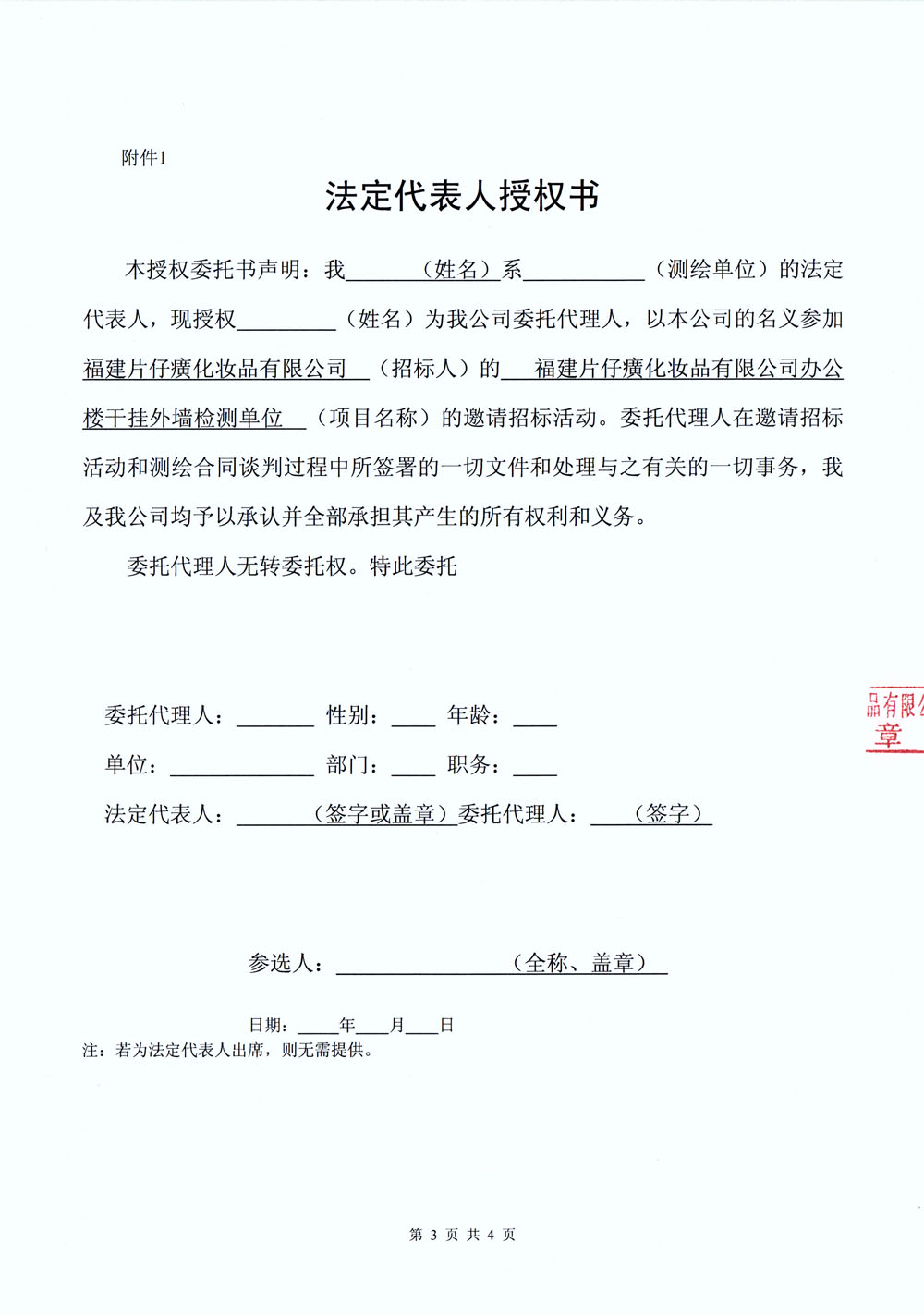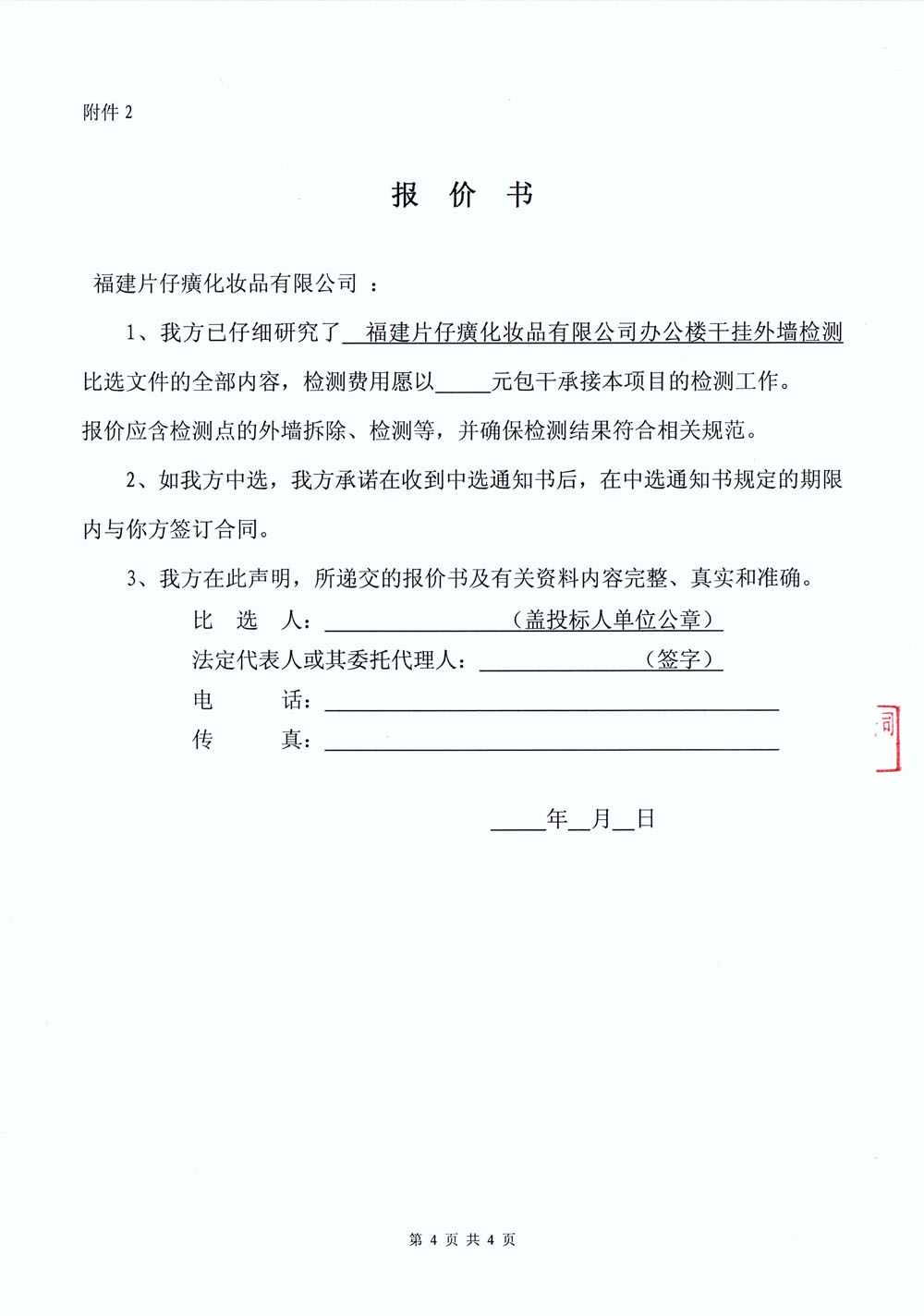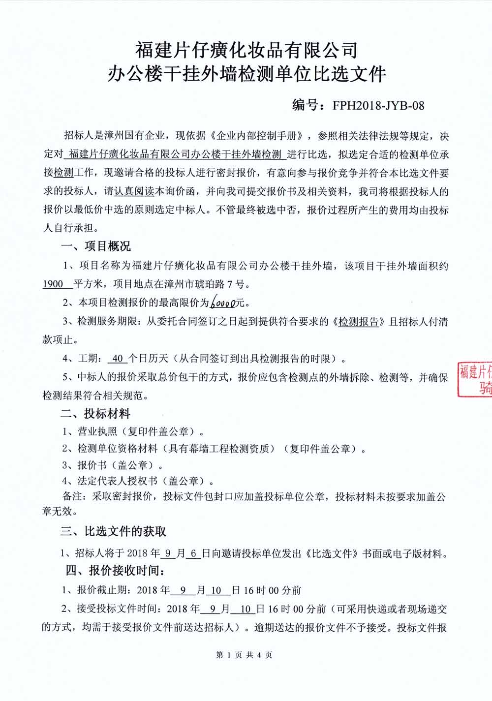 福建片仔癀化妆品有限公司办公楼干挂外墙检测单位比选文件