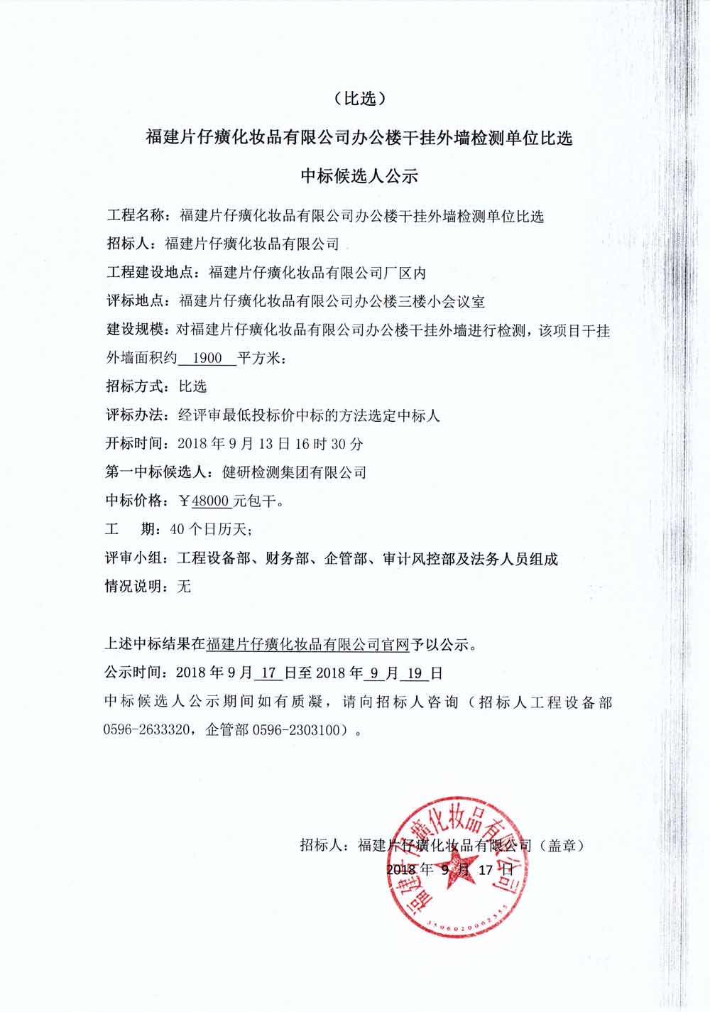 福建片仔癀化妆品有限公司办公楼干挂外墙检测单位比选中标候选人公示