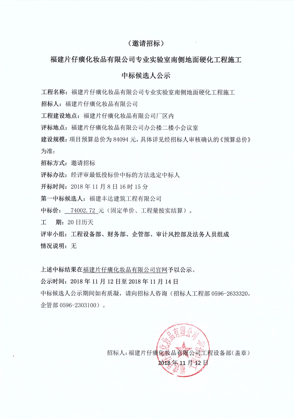 福建片仔癀化妆品有限公司专业实验室南侧地面硬化工程施工中标候选人公示