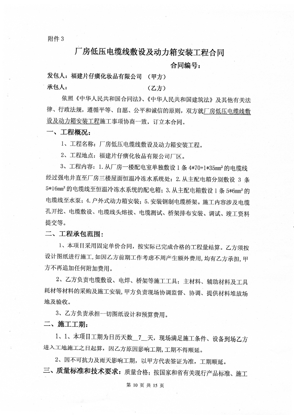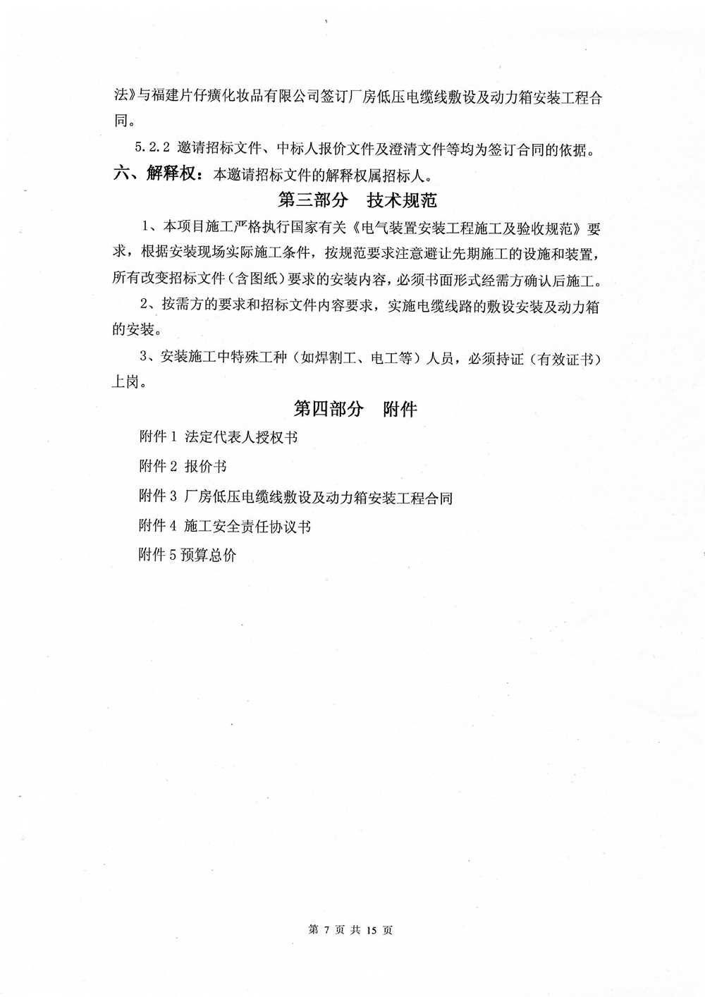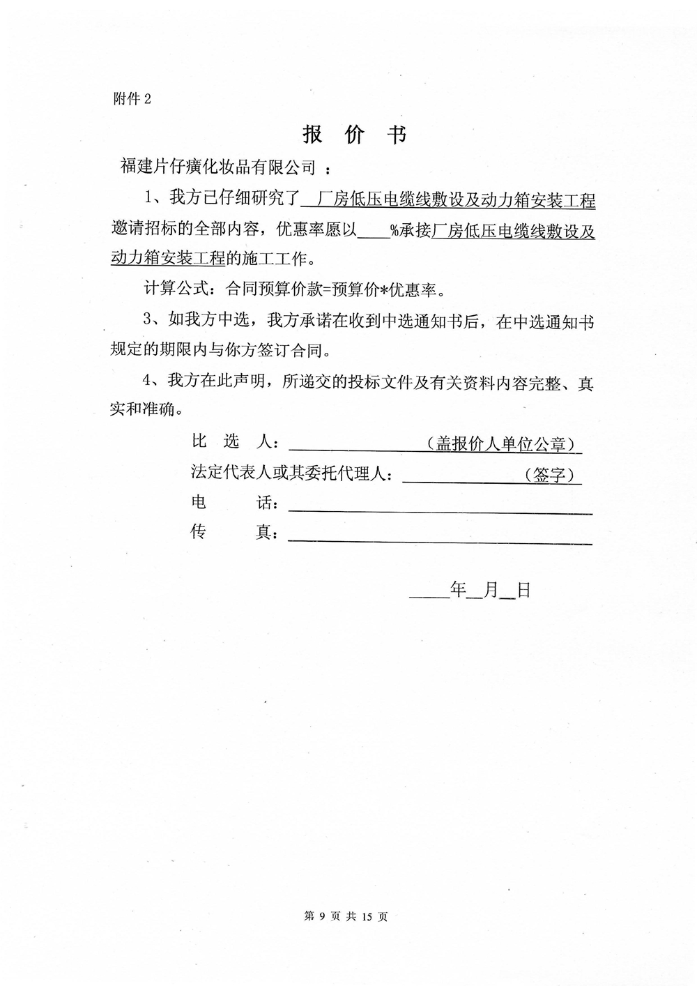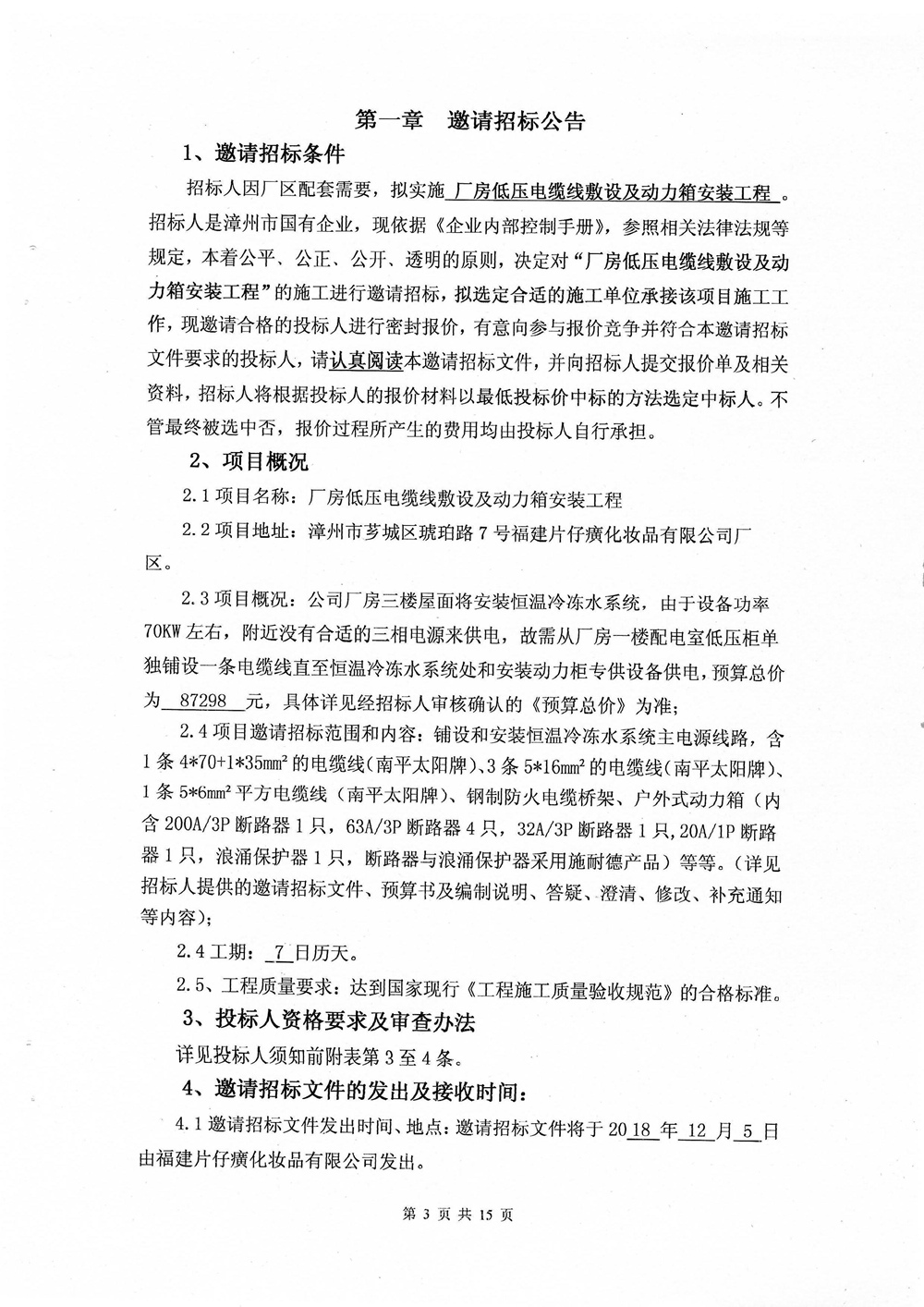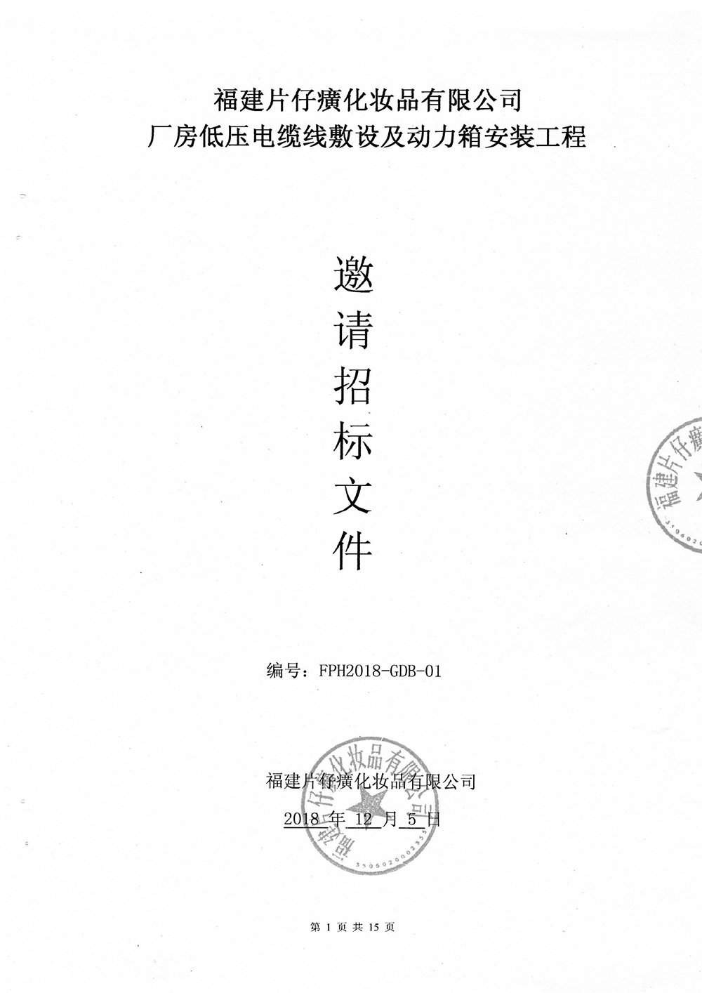 福建片仔癀化妆品有限公司厂房低压电缆线敷设及动力箱安装工程邀请招标文件
