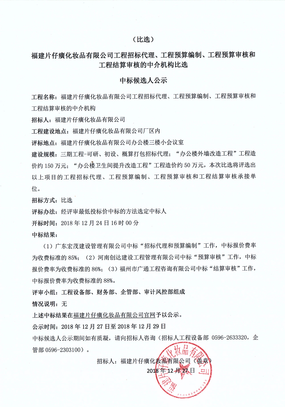 福建片仔癀化妆品有限公司工程招标代理、工程预算编制、工程预算审核和工程结算审核的中介机构比选中标候选人公示