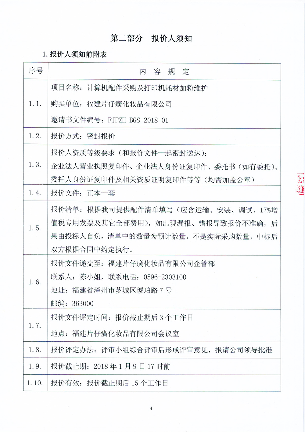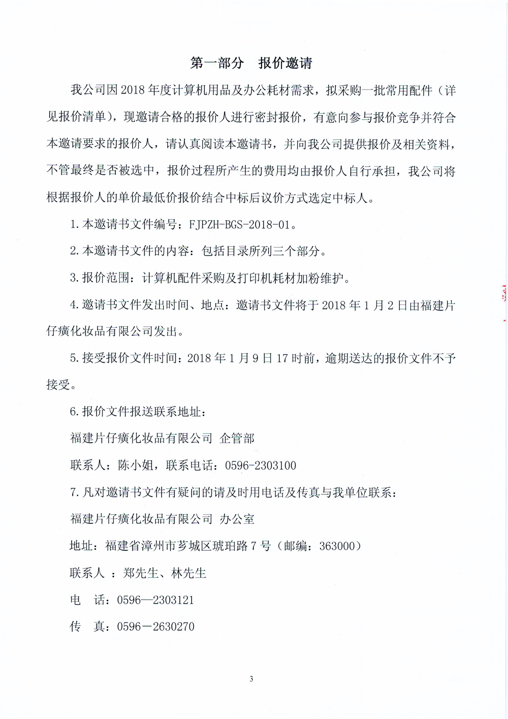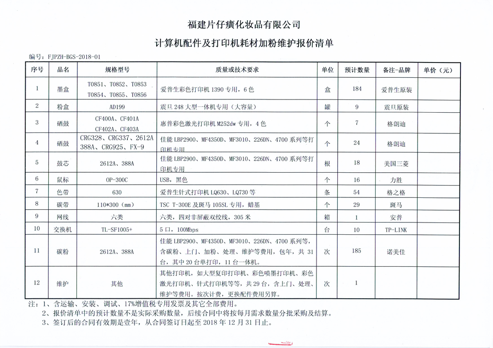 福建片仔癀化妆品有限公司计算机配件采购及打印机耗材加粉维护报价邀请书