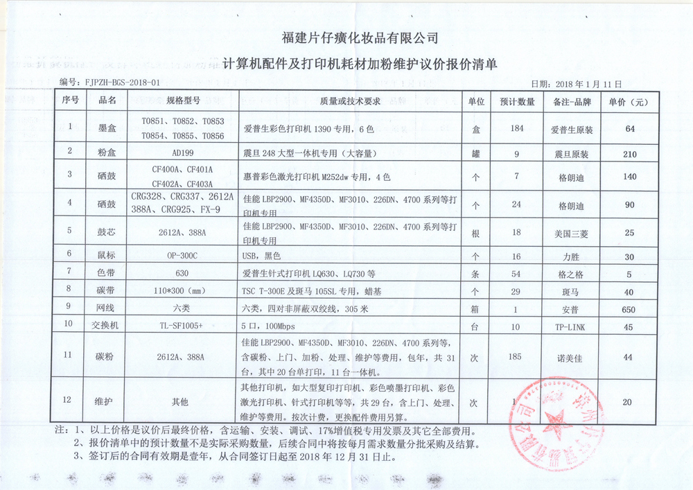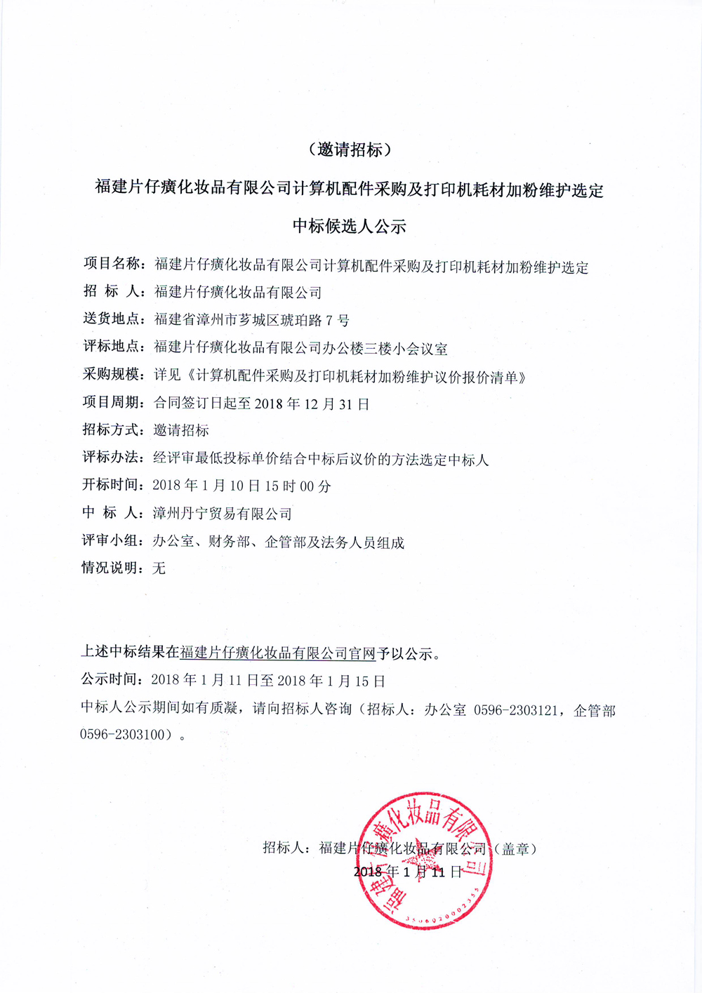 福建片仔癀化妆品有限公司计算机配件采购及打印机耗材加粉维护选定中标候选人公示