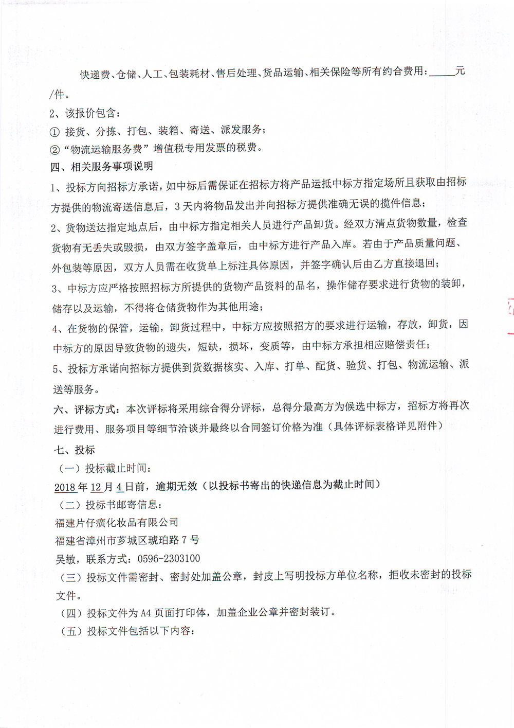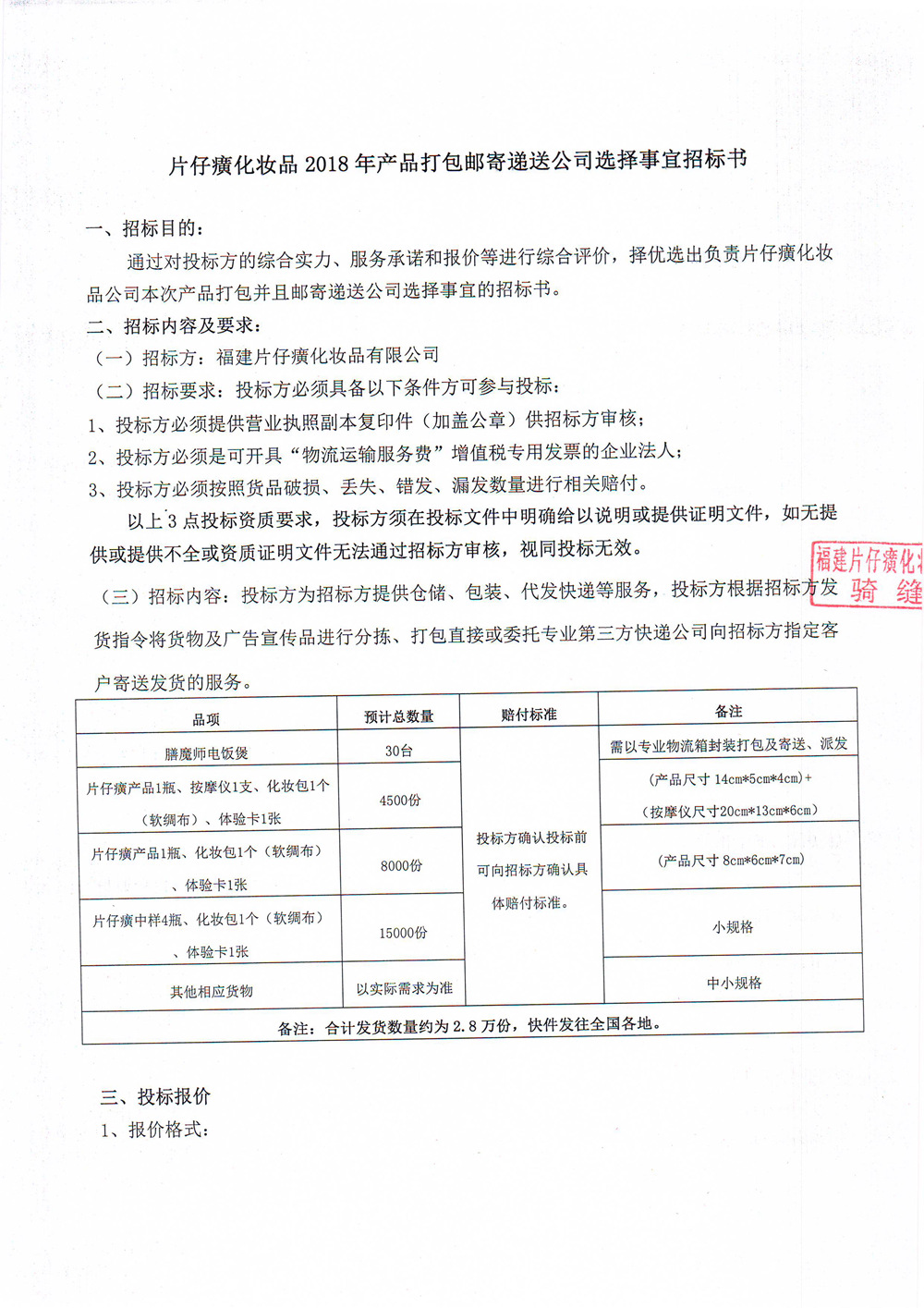 片仔癀化妆品2018年产品打包邮寄递送公司选择事宜招标书