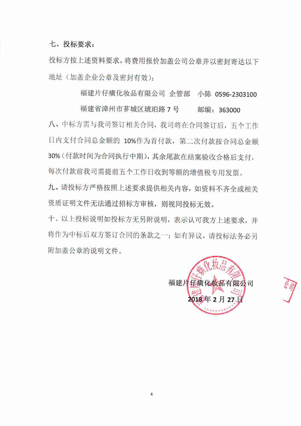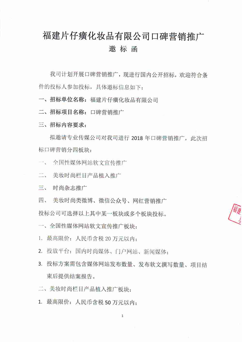 福建片仔癀化妆品有限公司口碑营销推广邀标函