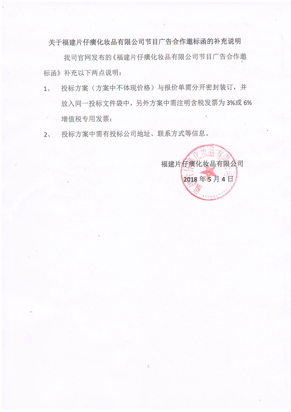 关于福建片仔癀化妆品有限公司节目广告合作邀标函的补充说明