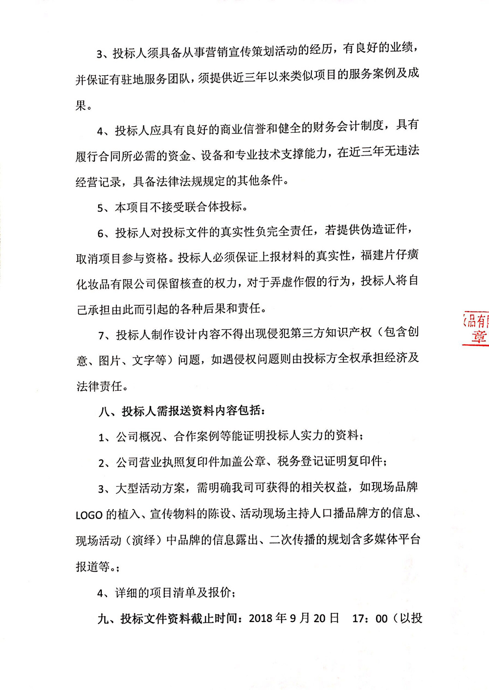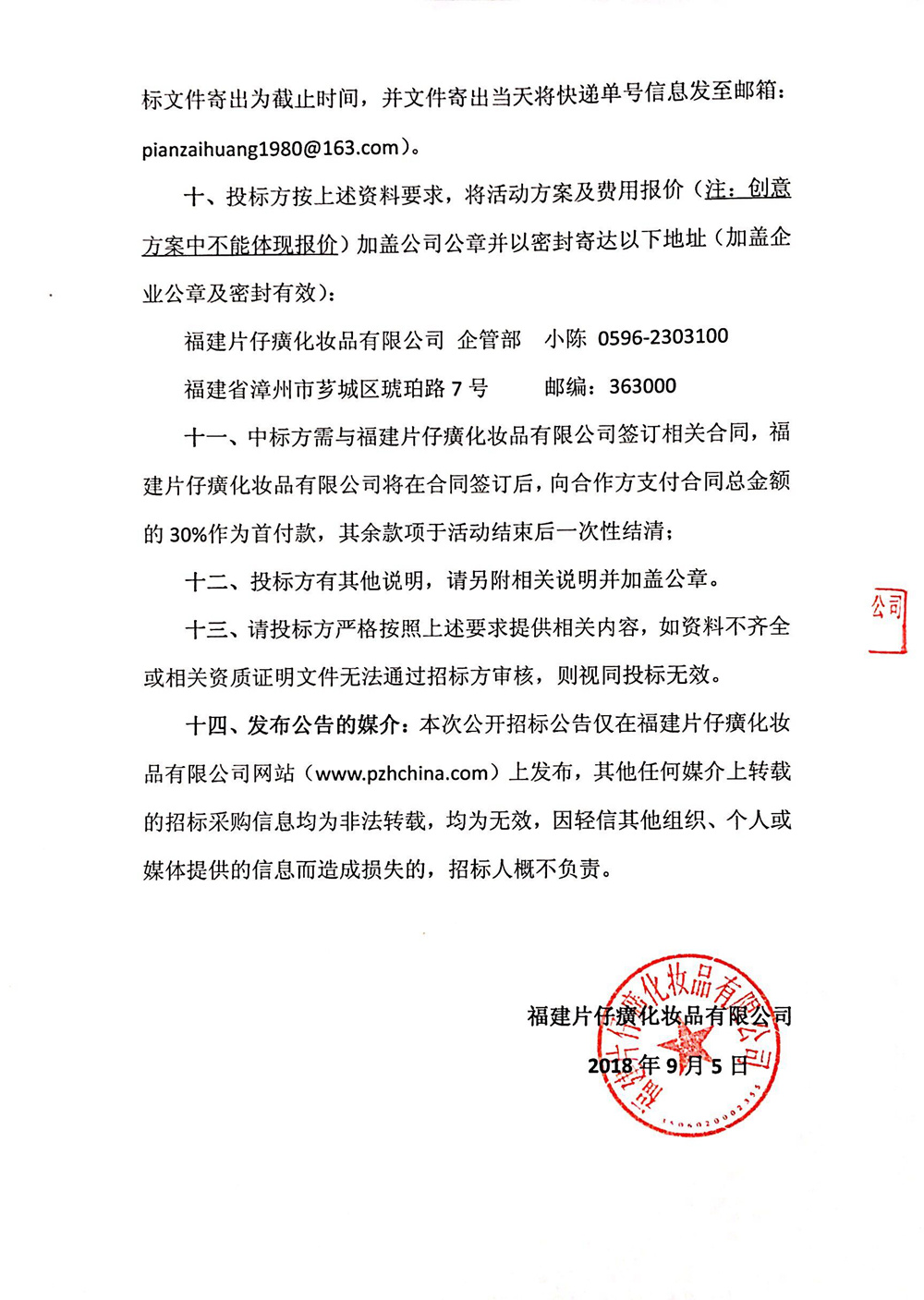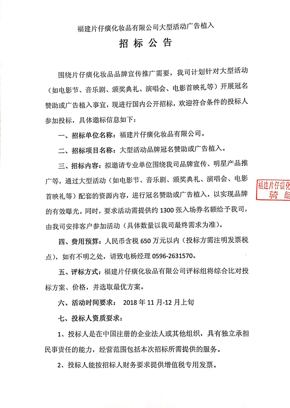 福建片仔癀化妆品有限公司大型活动广告植入招标公告