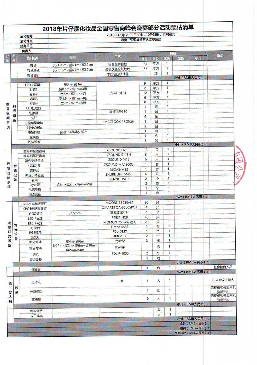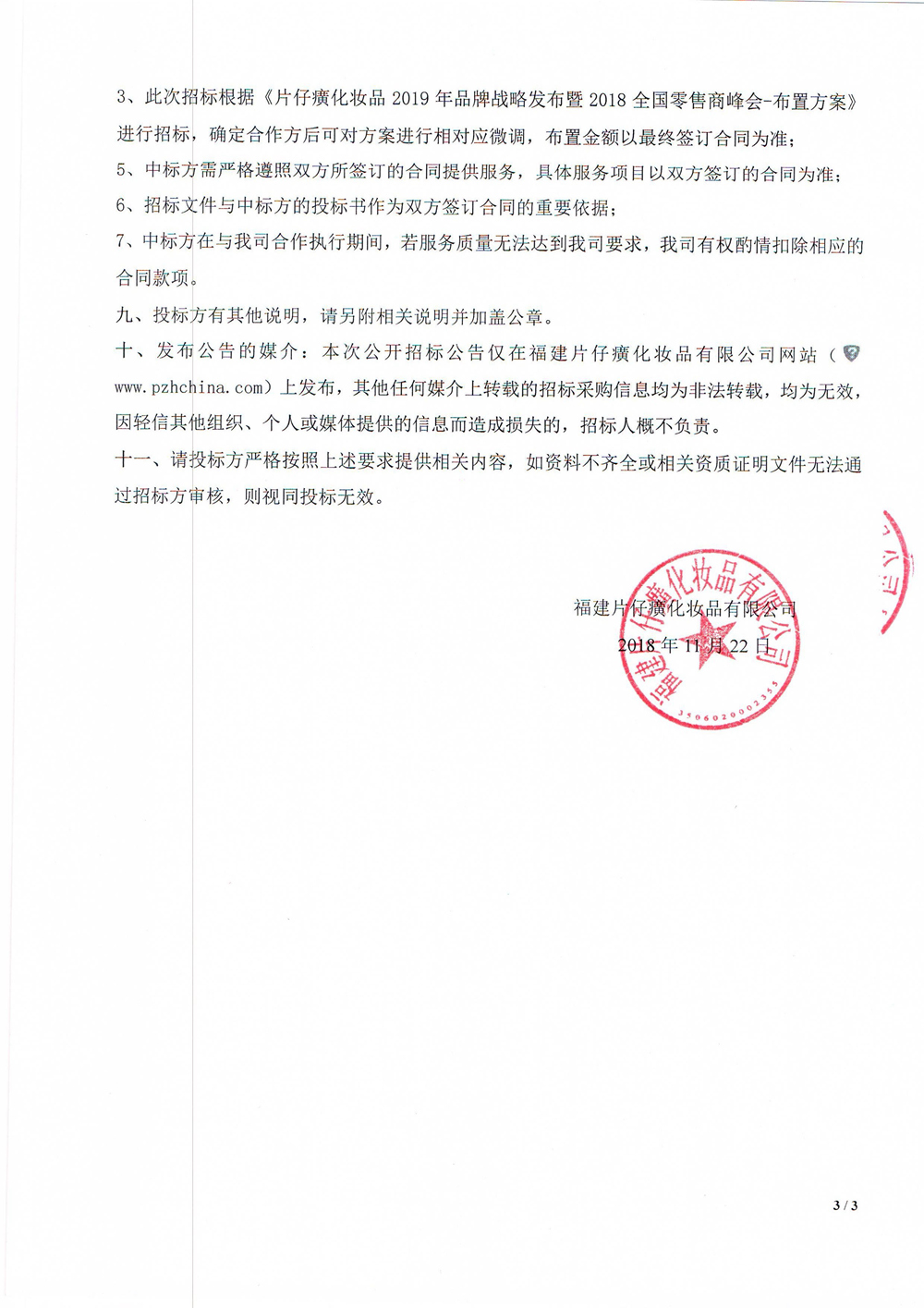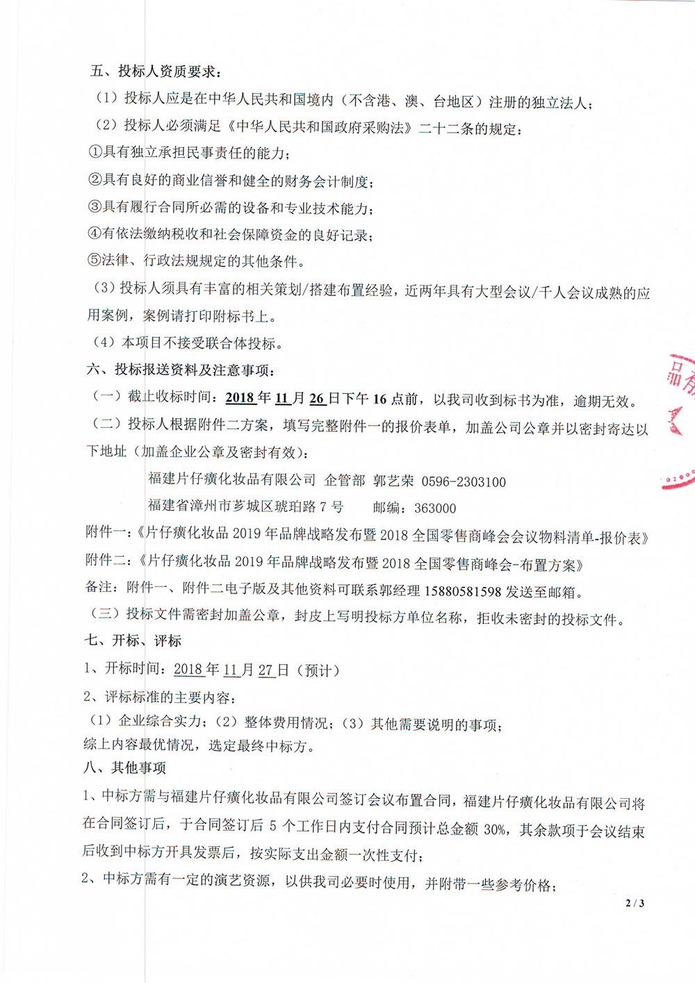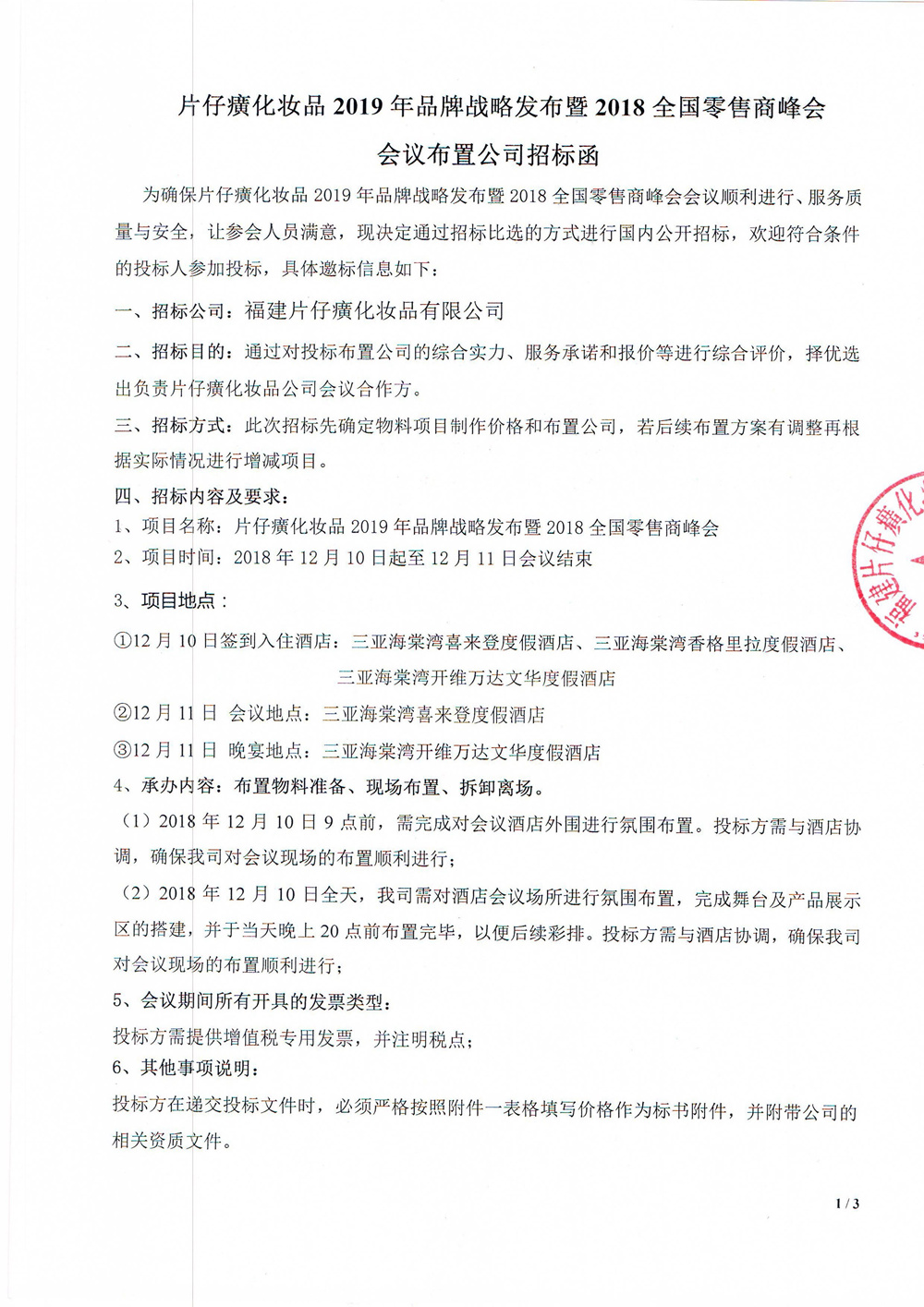片仔癀化妆品2019年品牌战略发布暨2018全国零售商峰会会议布置公司招标函