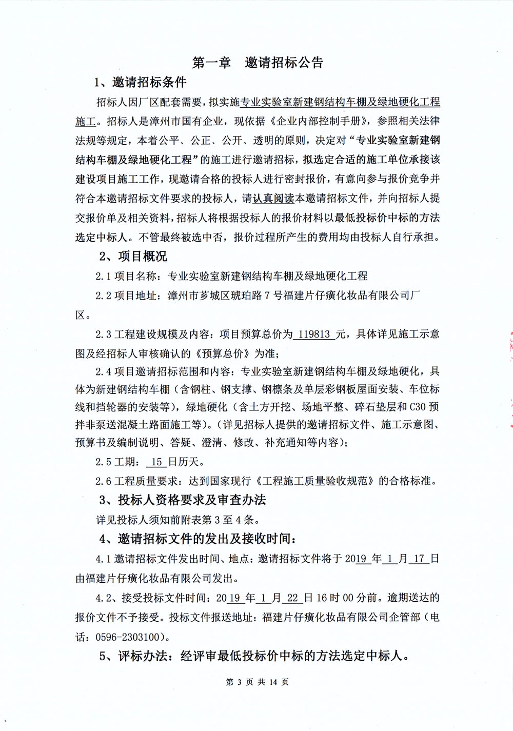 福建片仔癀化妆品有限公司专业实验室新建钢结构车棚及绿地硬化工程施工邀请招标文件