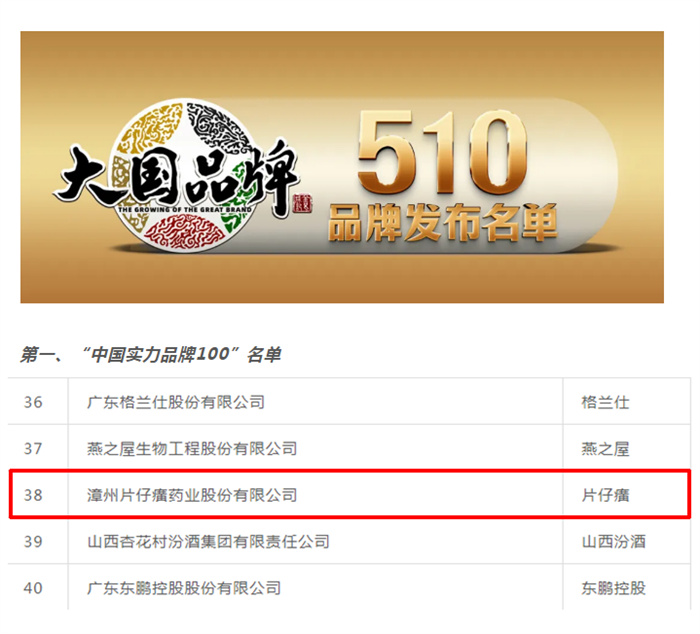 片仔癀品牌入选“中国可持续品牌100”(第38名)