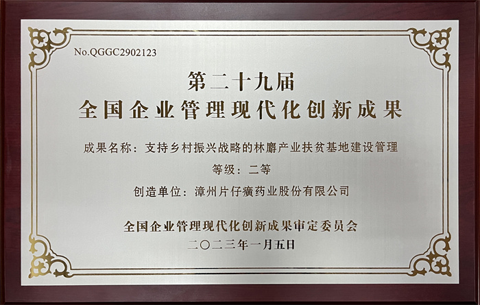 公司“支持乡村振兴战略的林麝产业扶贫基地建设管理”项目获得第二十九届全国企业现代化管理创新成果奖二等奖
