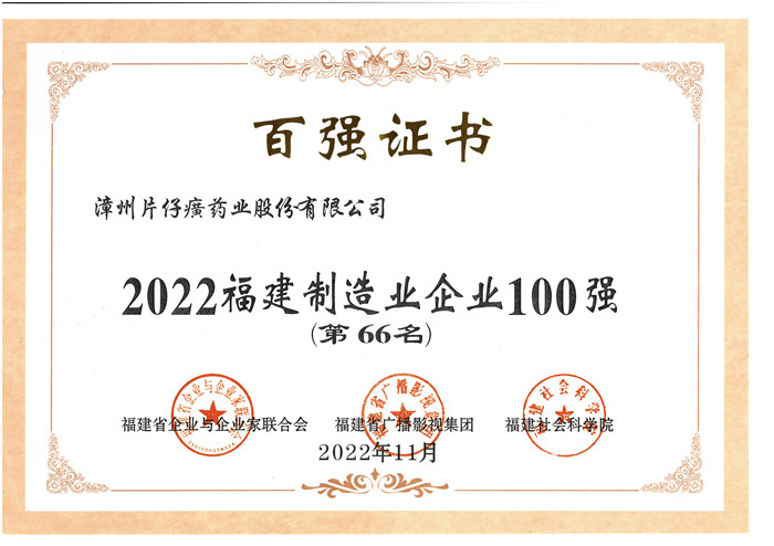 2022福建制造业企业100强(第66名)证书