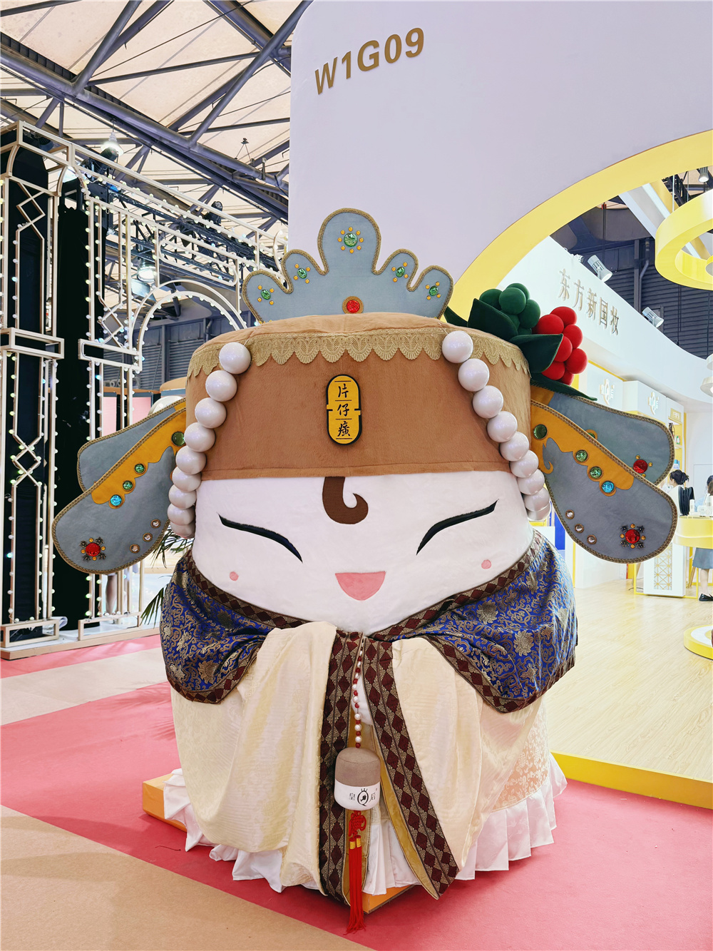 展馆内,最吸睛的当属片仔癀化妆品IP形象【癀小御】。值得一提的是,这也是IP形象癀小御的首次对外亮相,其设计灵感源自片仔癀珍珠膏“金色瓶盖+小瓷瓶瓶身”。癀小御佩戴明代皇后凤冠霞帔,身着明代皇后华服,无不彰显“皇后”雍容华贵之姿,与皇后品牌slogan“以美的底气 执掌未来”遥相呼应,此外,癀小御头戴三七花、人参花以及珍珠头饰,融合片仔癀化妆品的品牌标识,也传递出片仔癀化妆品传承,近500年片仔癀文化和中国千年草本文化,守护东方女性肌肤之美的理念,与片仔癀品牌slogan“东方智慧,御美人生”相互呼应。