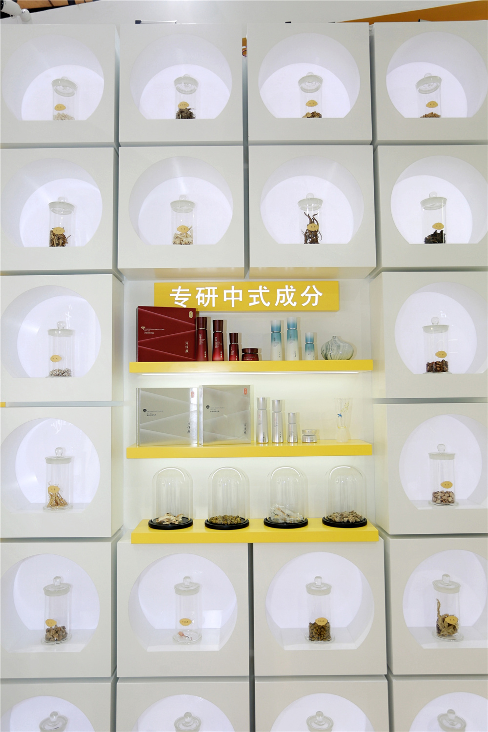 展馆中片仔癀化妆品中式成分墙也显得格外吸睛。在美妆行业都在卷研发、卷科技的当下,片仔癀化妆品40多年来,始终坚持匠心专研中式成分,坚持以制药的标准来做化妆品,并凭借中医药药企背景和品牌文化传承优势,在中式成分科研创新构建起一道差异化的竞争壁垒。