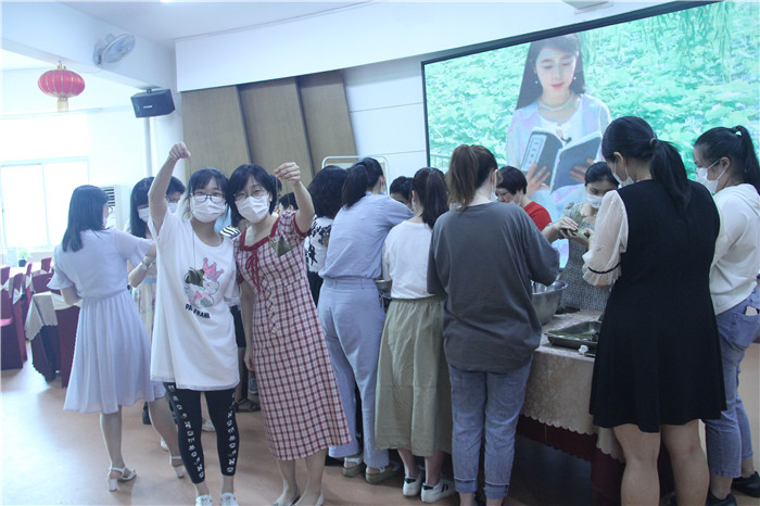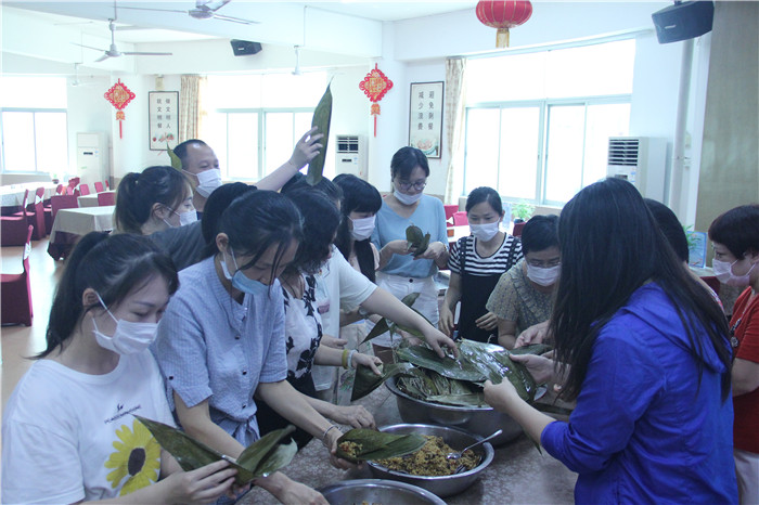 活动在诵读屈原《离骚》经典名句中拉开序幕。“路漫漫其修远兮,吾将上下而求索……,通过声情并茂的诵读,让大家深刻感受到屈原对于真理、对于信仰的执着追求,从中学习屈原伟大的胸襟和强烈的爱国主义精神和民族精神。大屏幕上还播放了与端午节相关的视频,让大家庭在观看中进一步了解端午节的历史文化背景和传统风俗民情。随后,大家围到了长桌前,在食堂阿姨的耐心示范和指导下,按照折叶、盛料、压实、裹叶、扎绳等步骤动手包起了粽子。你帮我梳理粽叶,我帮你捆绑粽绳,大家在分享中学习,在交流中成长,小小的粽子裹进了大家浓浓的情谊和深深的祝福,活动现场欢乐又温馨。大家把自己包好的粽子提在手上,看着自己丰硕的劳动成果,每个人的脸上都露出了灿烂的笑容。