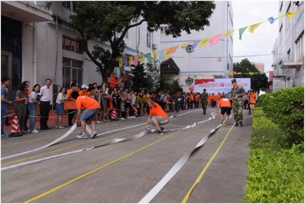 竞赛活动现场气氛紧张热烈,全体参赛队员不畏强手、顽强拼搏、奋勇争先、你追我赶,或手提灭火器,迅速奔向起火点,准确站位上风向,对准火源根部扑灭火源,或手提水枪、水带,边跑边接水带,成功连接消防水带。