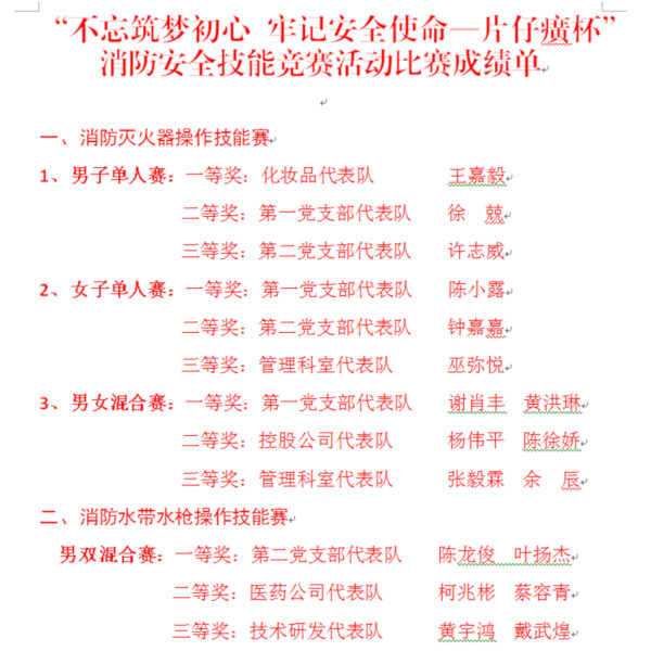 赛场上争分夺秒,竞争激烈,赛场下加油呐喊,相互勉励,气氛感人,充分展现了片仔癀人良好的精神面貌,极大地鼓舞了参赛队员的热情和斗志。经过紧张而激烈的角逐,获奖名单如下: