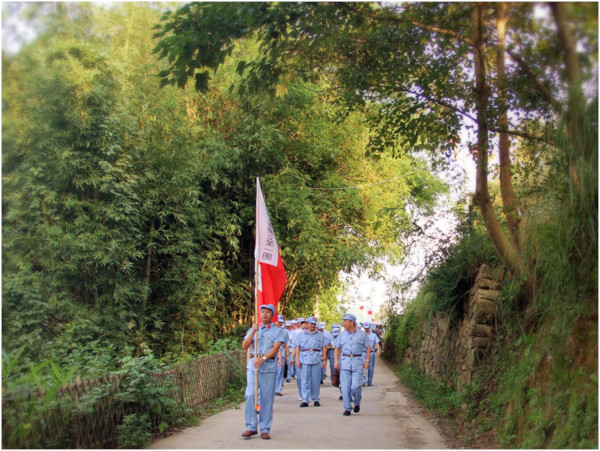 从纪念馆出来,学员们换上了红军服装,手举福建省第一支红色革命武装“福建工农革命军独立第一团”的军旗,走着整齐的步伐来到90年前这支部队曾经操练的古榕树下,进行平和暴动攻城誓师大会现场模拟教学,真实再现当时大战来临的场景,寻觅当年那炮火纷飞的印记。遒劲有力,树冠如盖的撑天古榕见证着历史的烟消云散,不变的是中国共产党不变的初心。