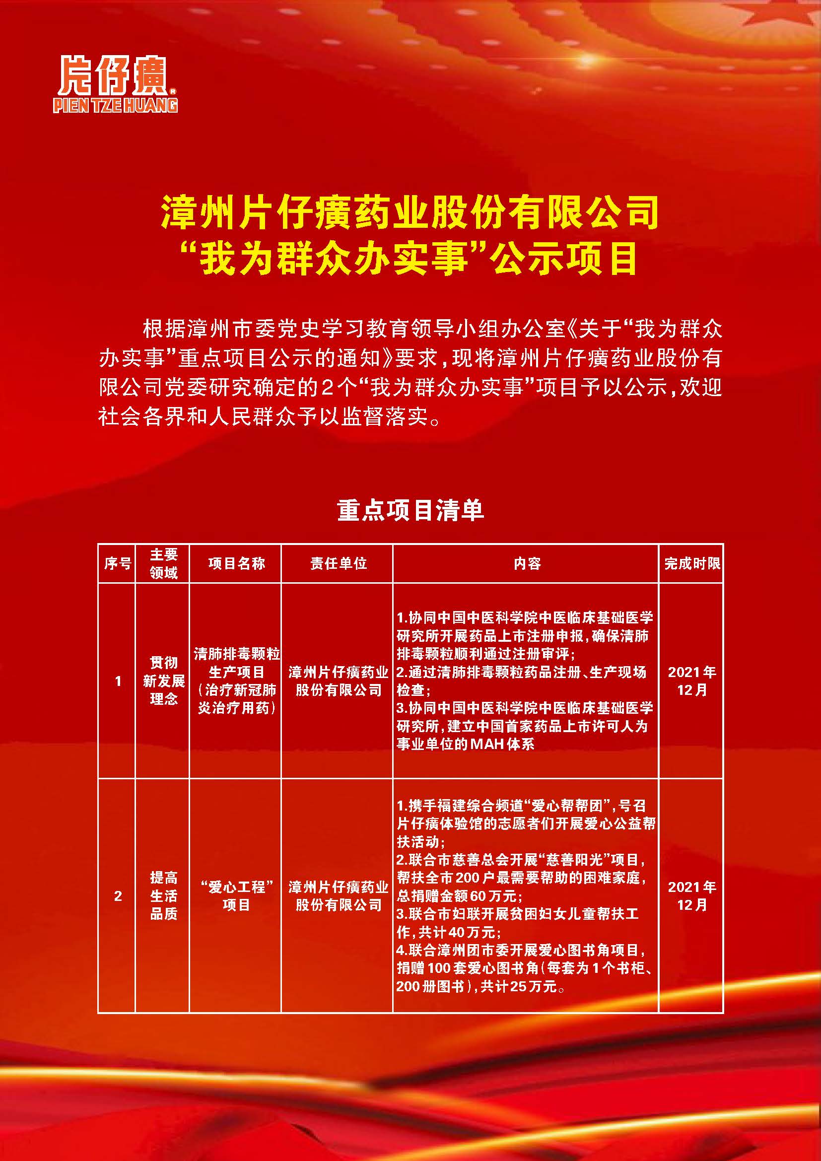 中共漳州片仔癀药业股份有限公司委员会“我为群众办实事”重点项目公示