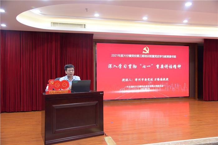 2021年7月21日至23日,片仔癀药业公司党委组织开展片仔癀党校第三期培训班暨党史学习教育专题读书班,推动全体学员进一步深入学习领会习近平总书记重要讲话精神,深刻领悟党的百年历史的红色内涵。此次专题读书班采取专家理论授课、现场参观教学和自学等方式进行,使专题读书班形式更加多样、内容更加丰富。