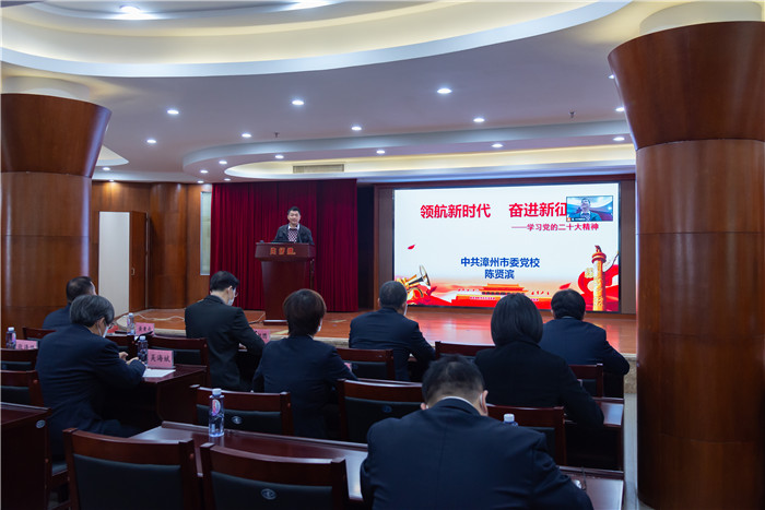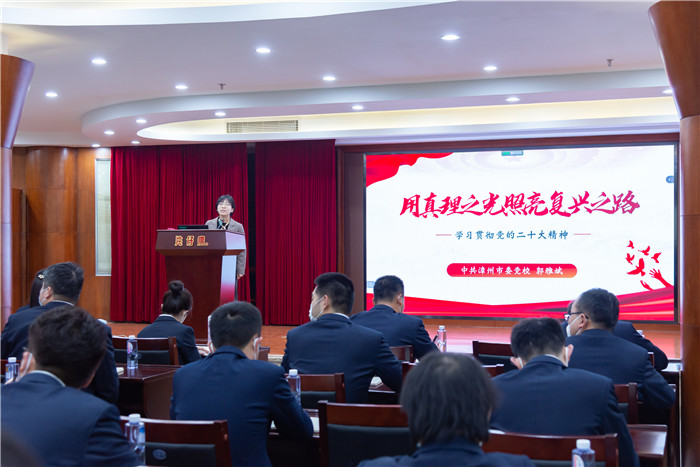 市委党校哲学法学教研室主任、副教授陈贤滨老师以《领航新时代奋进新征程——学习党的二十大精神》为主题讲授了第一课,从深刻把握大会的主题、过去5年工作和新时代10年伟大变革、习近平新时代中国特色社会主义思想的世界观和方法论、以中国式现代化全面推进中华民族伟大复兴和以伟大自我革命引领伟大社会革命这五个方面展开授课,切实增强全体党员贯彻落实党的二十大精神的政治自觉、思想自觉和行动自觉。